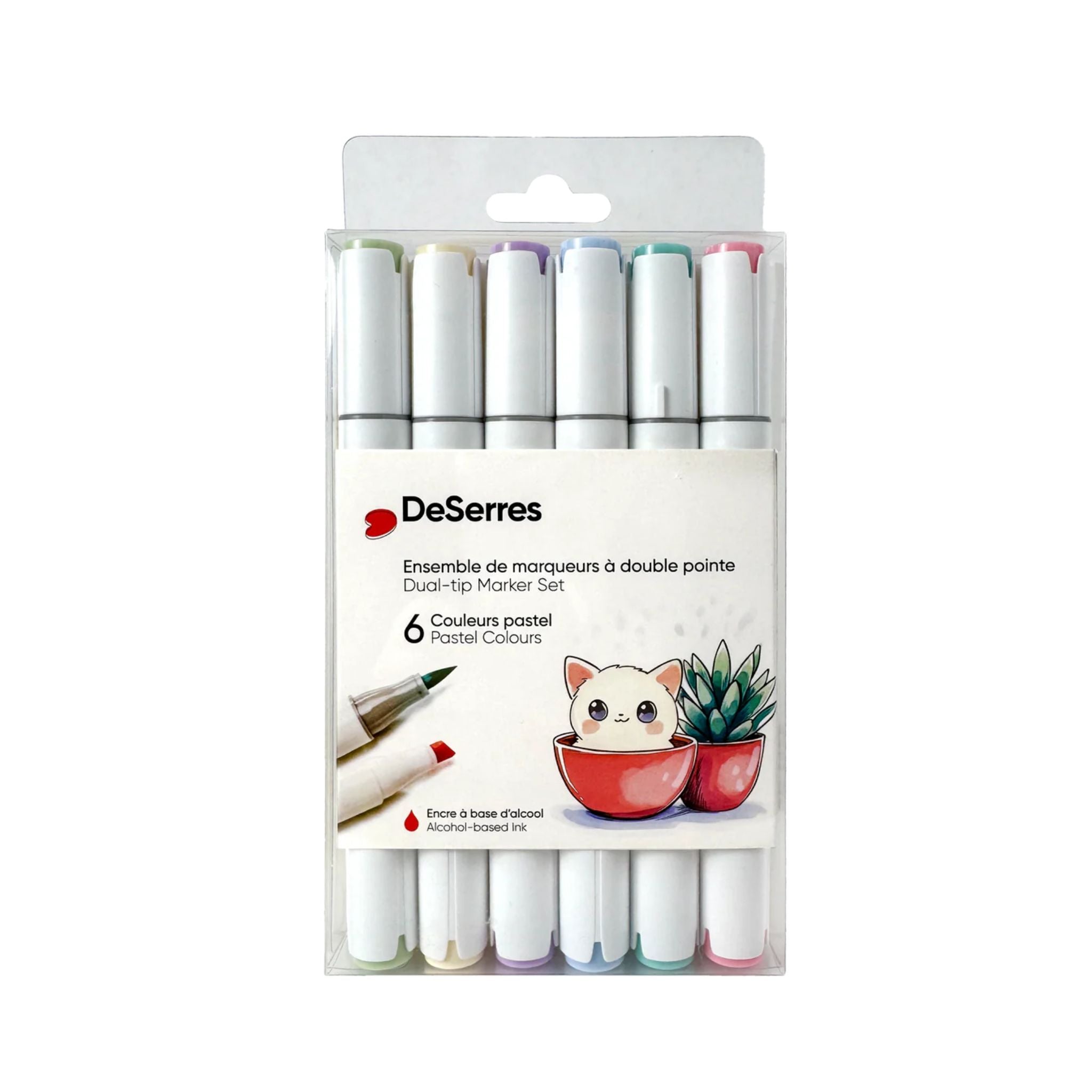This set of 6 pastel markers combines a smooth nylon brush tip with a precise chisel tip. The alcohol-based ink ensures quick drying, seamless blending, and luminous tones. Perfect for scrapbooking, DIY projects, and all your elegant creations.