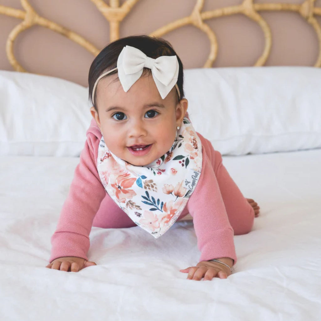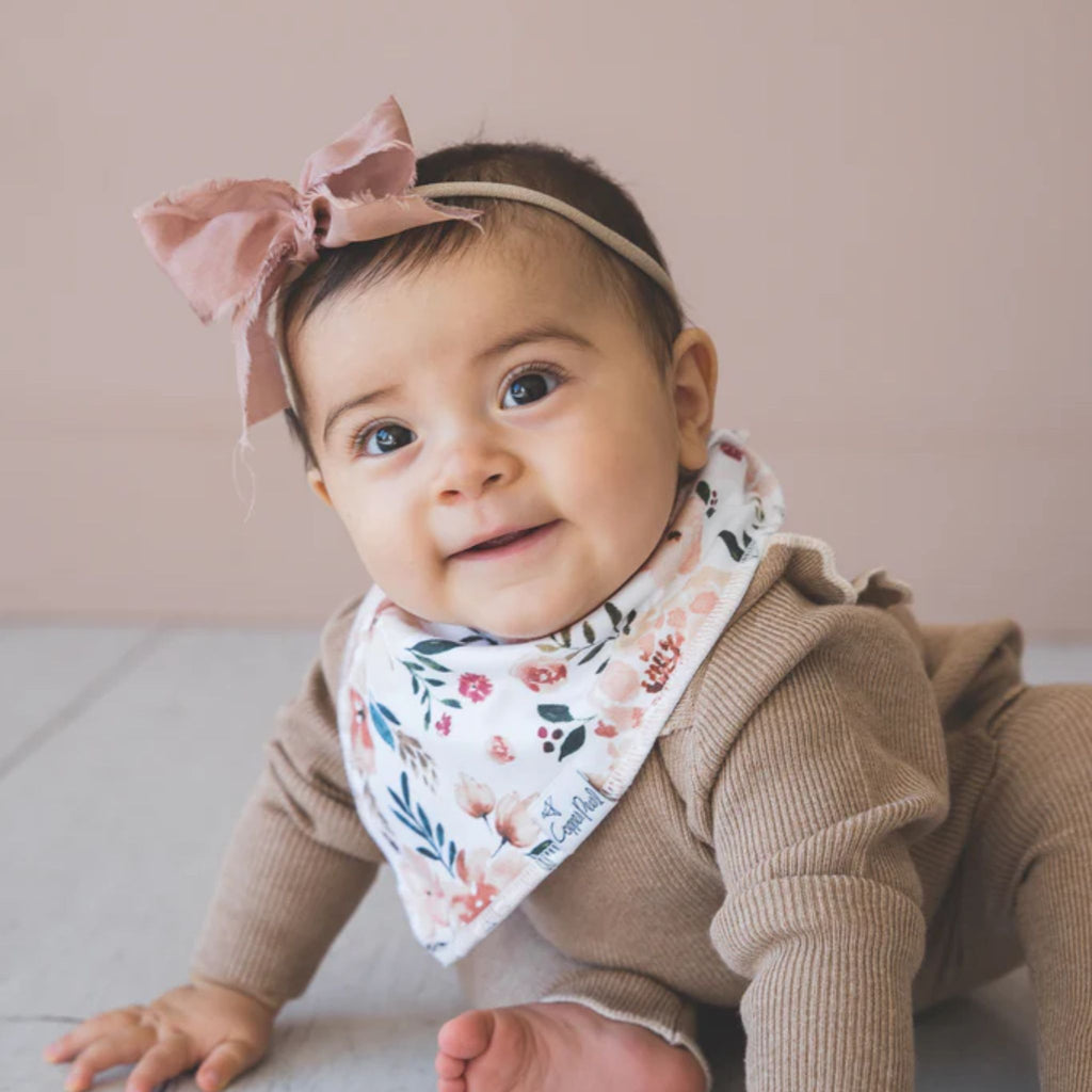 Each baby bandana bib comes with 2 nickel-free snaps that allow each bib to be adjustable in size to fit newborns and toddlers.  The snaps are secure, making it difficult for infants and toddlers to unfasten but are easy for parents to snap on and off.