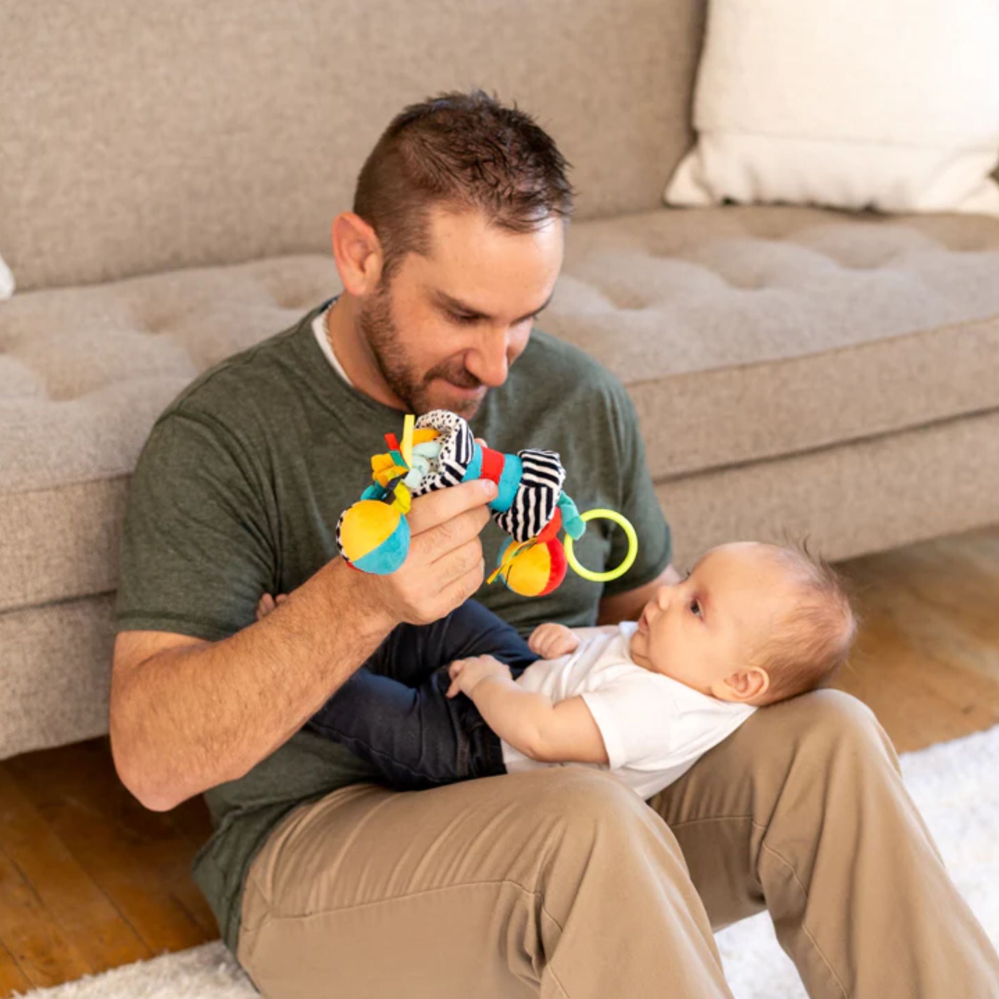 Easy-to-grasp, soft fabric design features crinkle textures, a chime, rattle, teethers, and more! We’ve packed oodles of sensory play fun into this little gem. One ball features a chime, the other a squeaker, plus there are crinkle fabrics and elastic cords to add to the auditory and textural experience. The silicone teether and plastic ring offer two different textures for baby to explore with their hands and mouths.