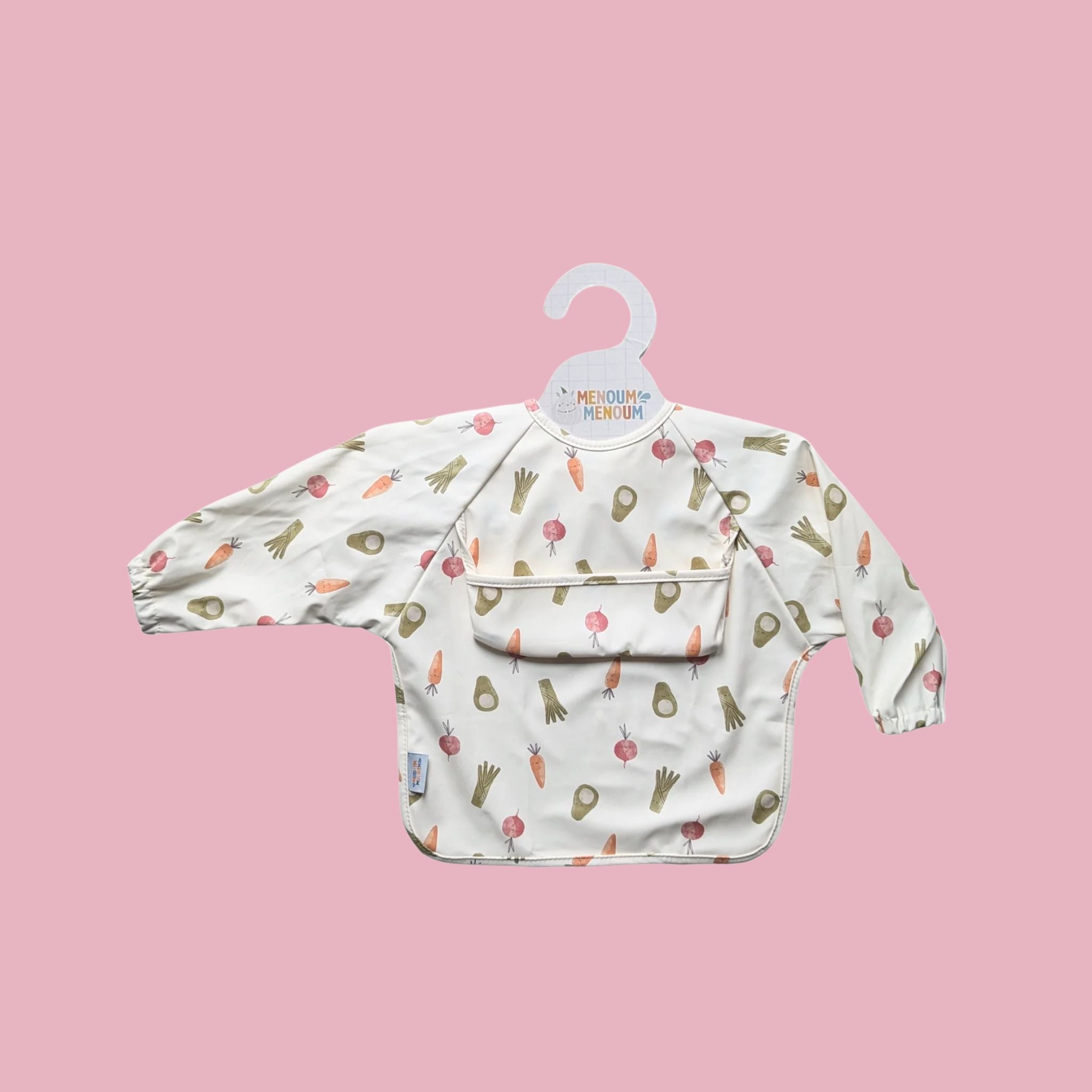 This Long Sleeves Bib has a special food catcher pouch that folds up. It's practical and will be appreciated for meal times! Unlike other bibs, which have a pocket at the bottom of the apron, the pocket of this bib is placed at the height of the torso to receive food residue properly. The pouch folds up when washing for easier cleaning.
