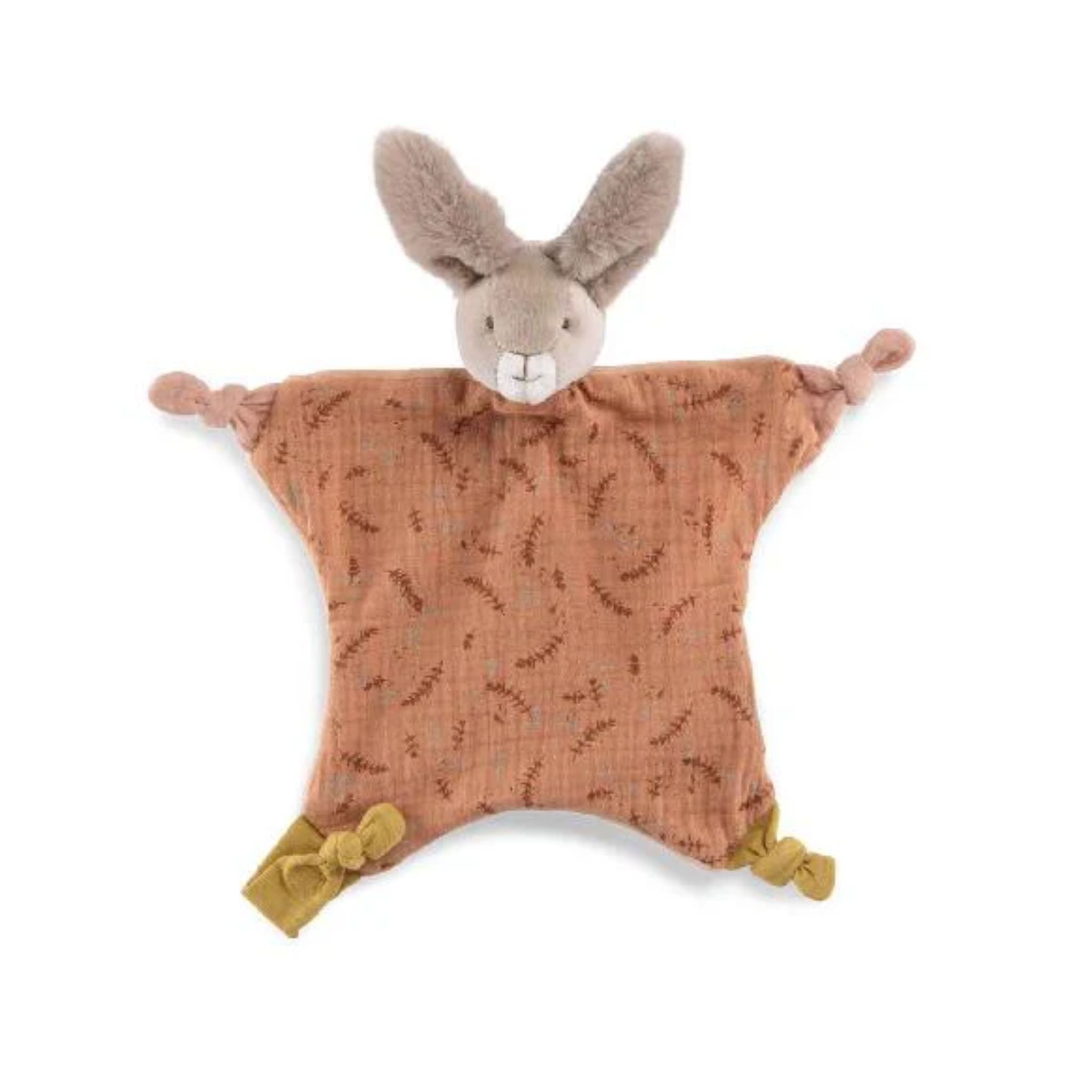 Clay rabbit is a comforting little dual fabric friend with big, super soft ears and delicate patterns on one side. With knots on each corner, it is easy for little hands to grip. Comes with a soother clip.