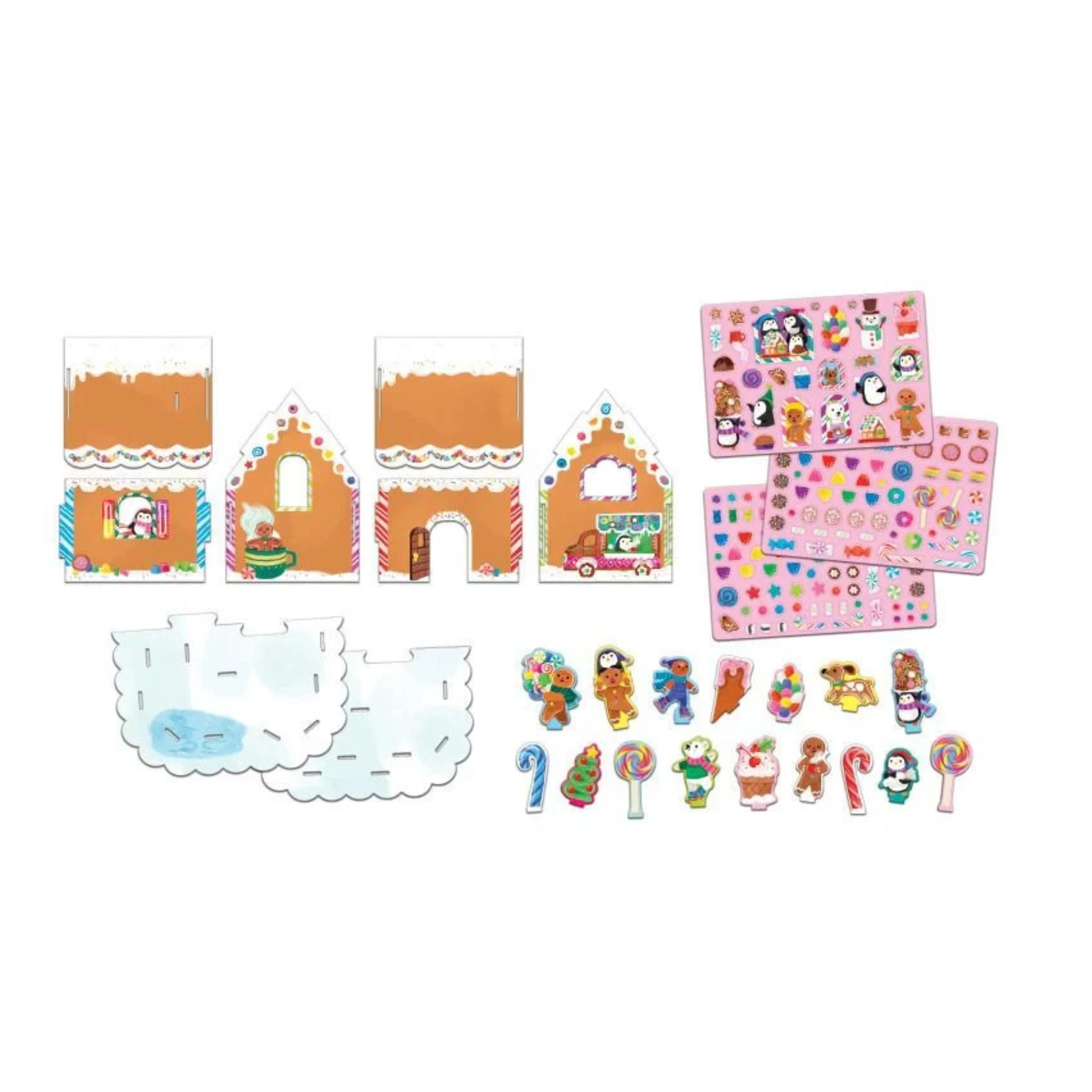 Have fun creating a unique gingerbread house with this fun set! Easy to assemble, children build their own gingerbread house, decorate it with glittery stickers and invent stories with fun characters like a snowman or an ice-skating bear.