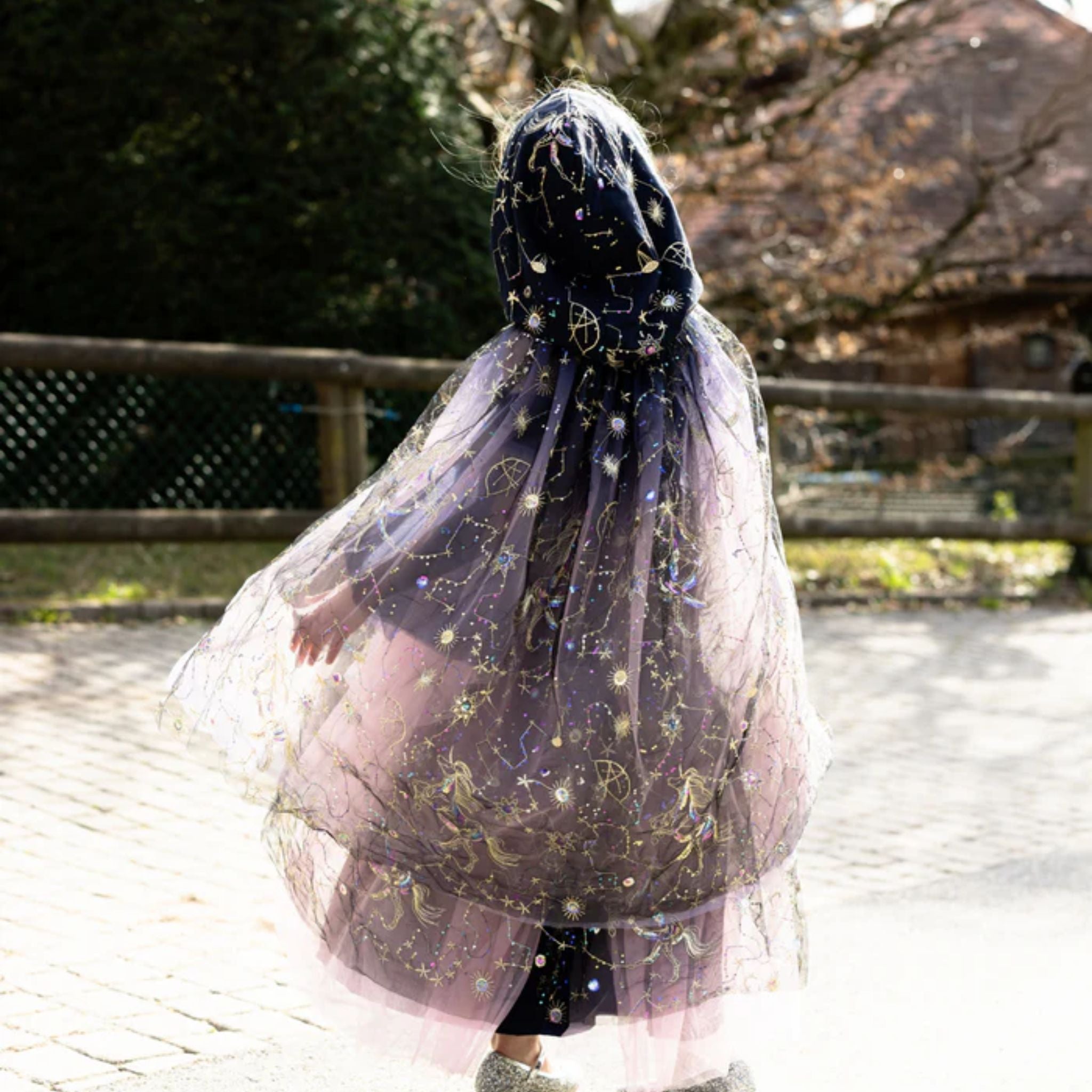 A roomy hood adds an air of mystery and magic, while a secure velcro closure at the neck makes it easy to slip on and off. Whether they're casting spells, chasing fireflies, or simply playing pretend, this cloak wraps your child in twilight wonder.