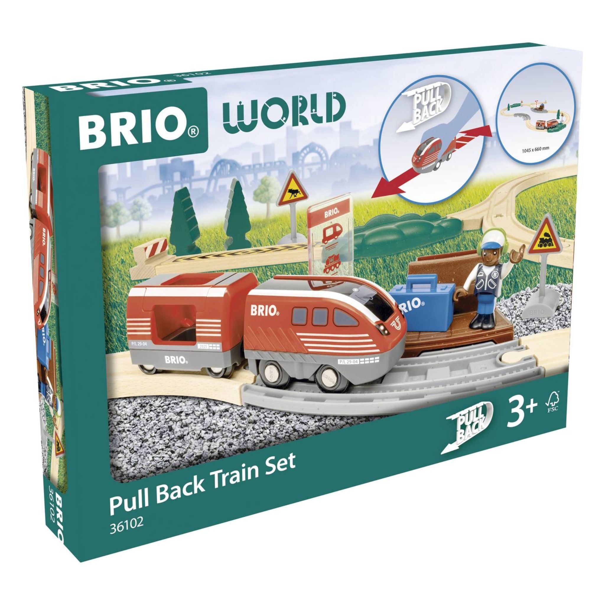 Powered by 100% toddler energy, this Pull Back Train Set needs no batteries to bring big smiles to little faces. Let the passenger board at the station, draw back the red train and watch it go. When it slows down, just pull it back again for more action. With easy-to-use functions and classic BRIO magnets, this countryside-themed set is a great addition to any BRIO World collection.
