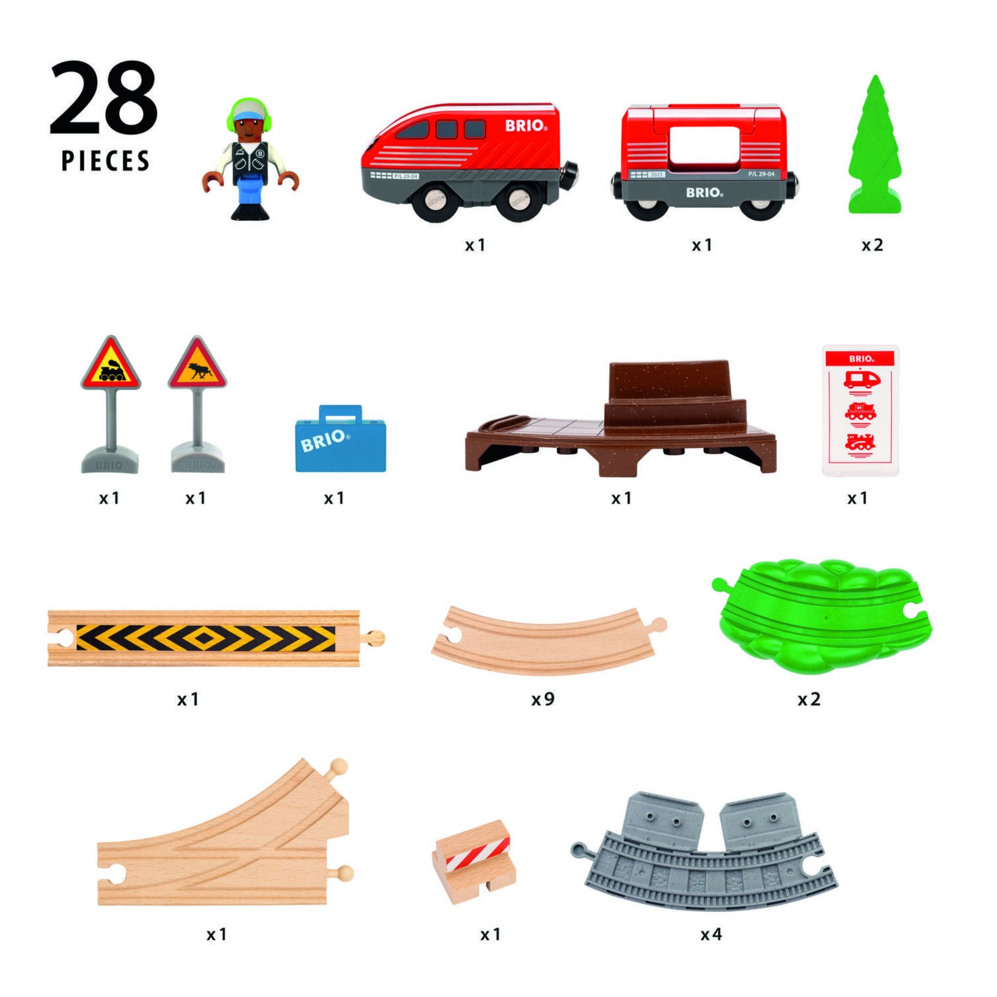 Includes: 28 pieces: 1 Pull Back Train, 1 Travel Passenger Wagon, 1 Travel Figure, 1 Station Platform, 4 Station Platform Tracks, 2 Wooden Trees, 2 Scenic Tracks, 12 Wooden Track Pieces and multiple accessories