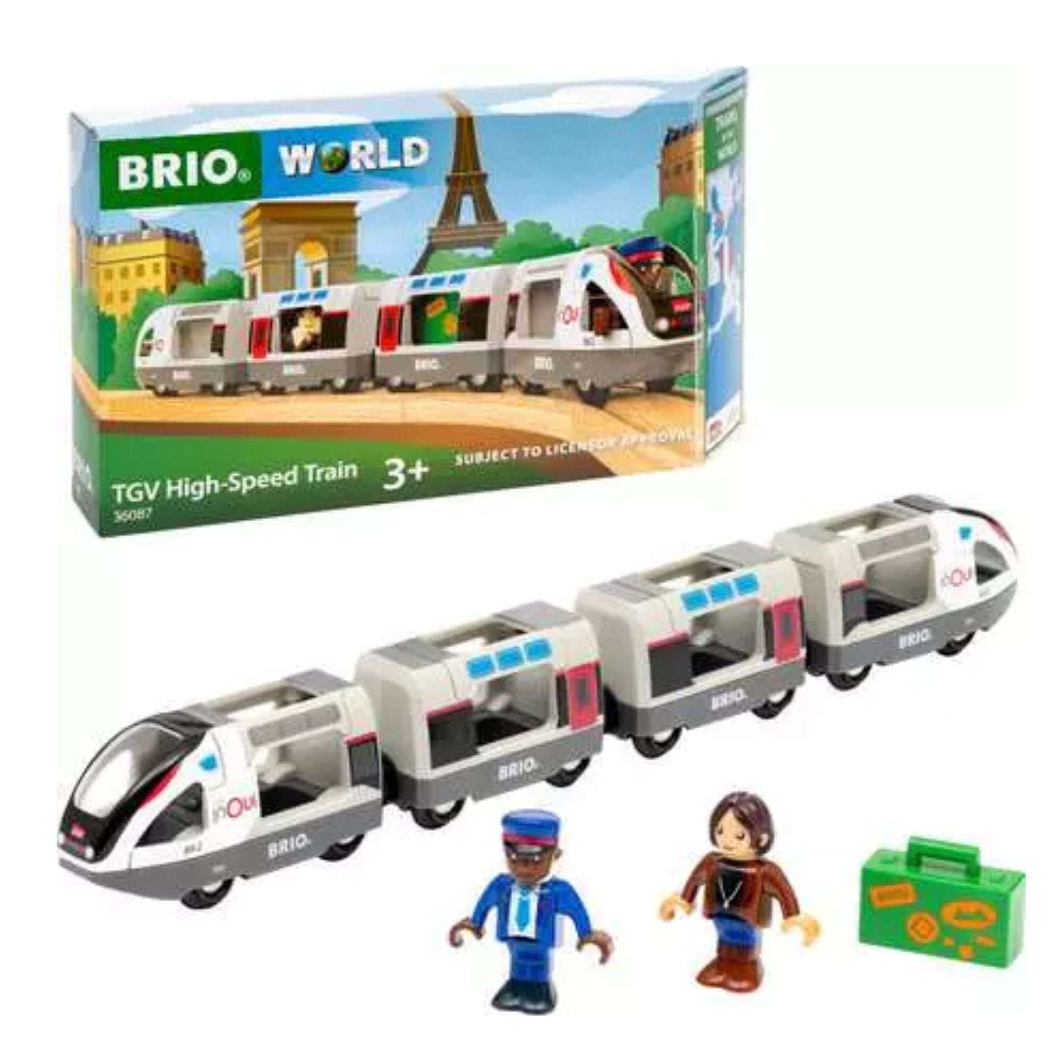 Includes: 2x High-Speed Engines, 2x Passenger Carriages, 2x BRIO World Characters, 1x Suitcase Accessory.