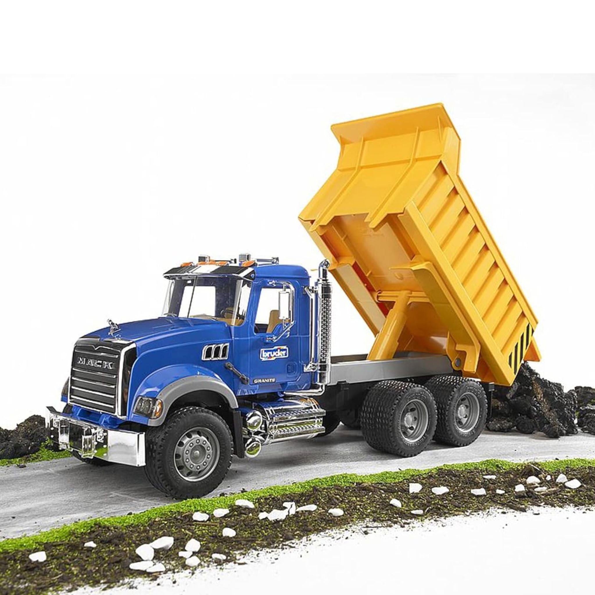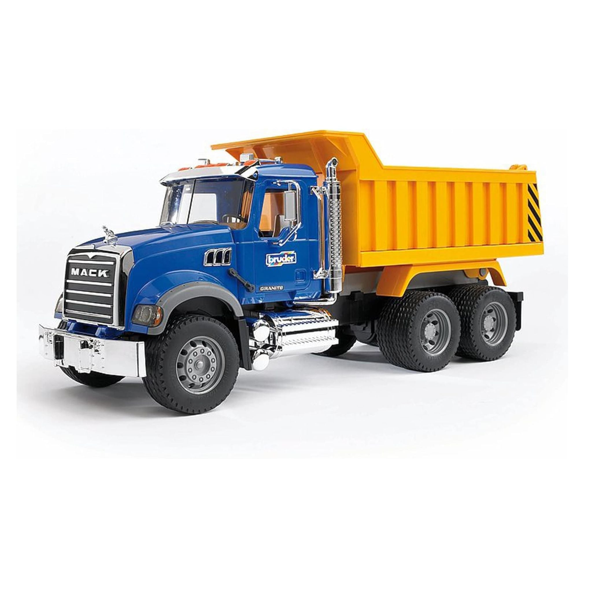 The incredibly realistic driver's cabin features doors that can be opened, a tilting engine bonnet which provides a full view of the engine block, folding side-view mirrors, and the many add-on accessories which give these trucks their chrome look! Bruder's MACK Granite Truck is known for its bulldog logo, quality, and toughness. This dump truck also features a tilting dump trough and tailgate that can be opened. The MACK Granite Truck is a feast for the eyes of every truck fan!