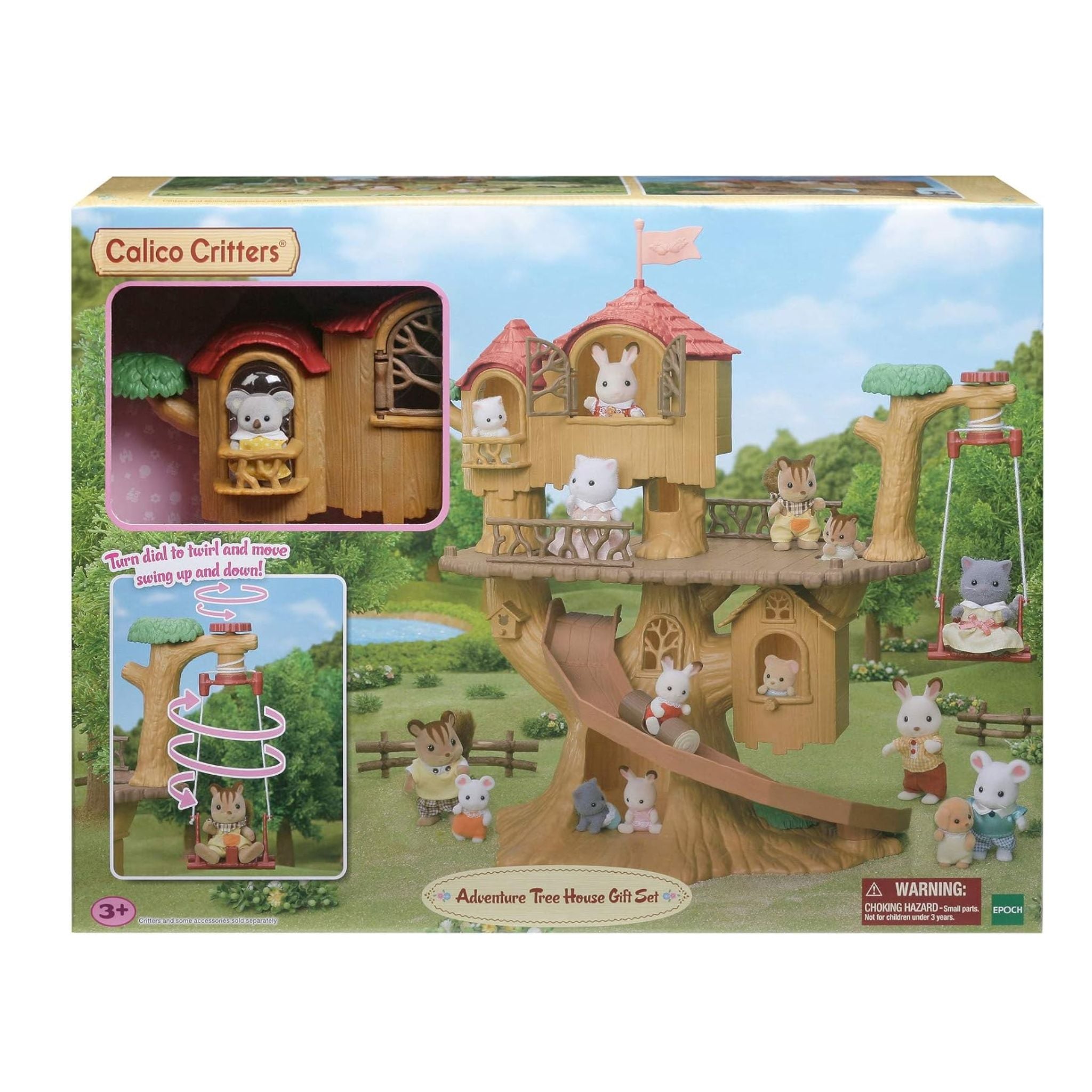 The Calico Critters Adventure Tree House Gift Set offers a captivating three-tier play environment designed for Calico Critters babies. It features engaging activities like climbing the rope swing, sliding down the log slide, exploring tree stumps, and relaxing in the treetop lookout tower. The set includes a poseable, 1.75" Outback Koala baby Adelaide figure with removable clothing, enhancing interactive play. Designed for children aged 3 and up, this playset connects seamlessly with the Lakeside Lodge and Baby Ropeway Park, expanding imaginative play possibilities and fostering creativity through pretend adventures.