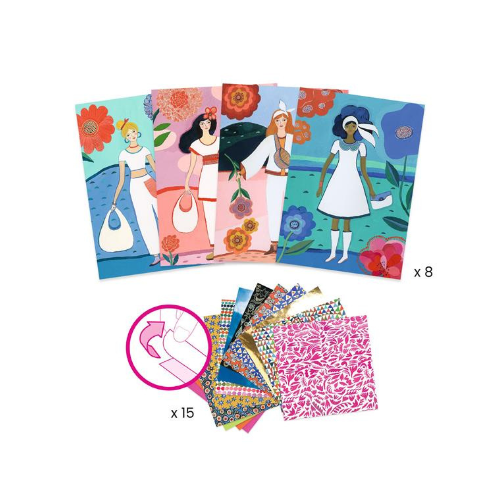 Includes: 8 cards, 15 self-adhesive sheets (including patterned and metallic sheets).