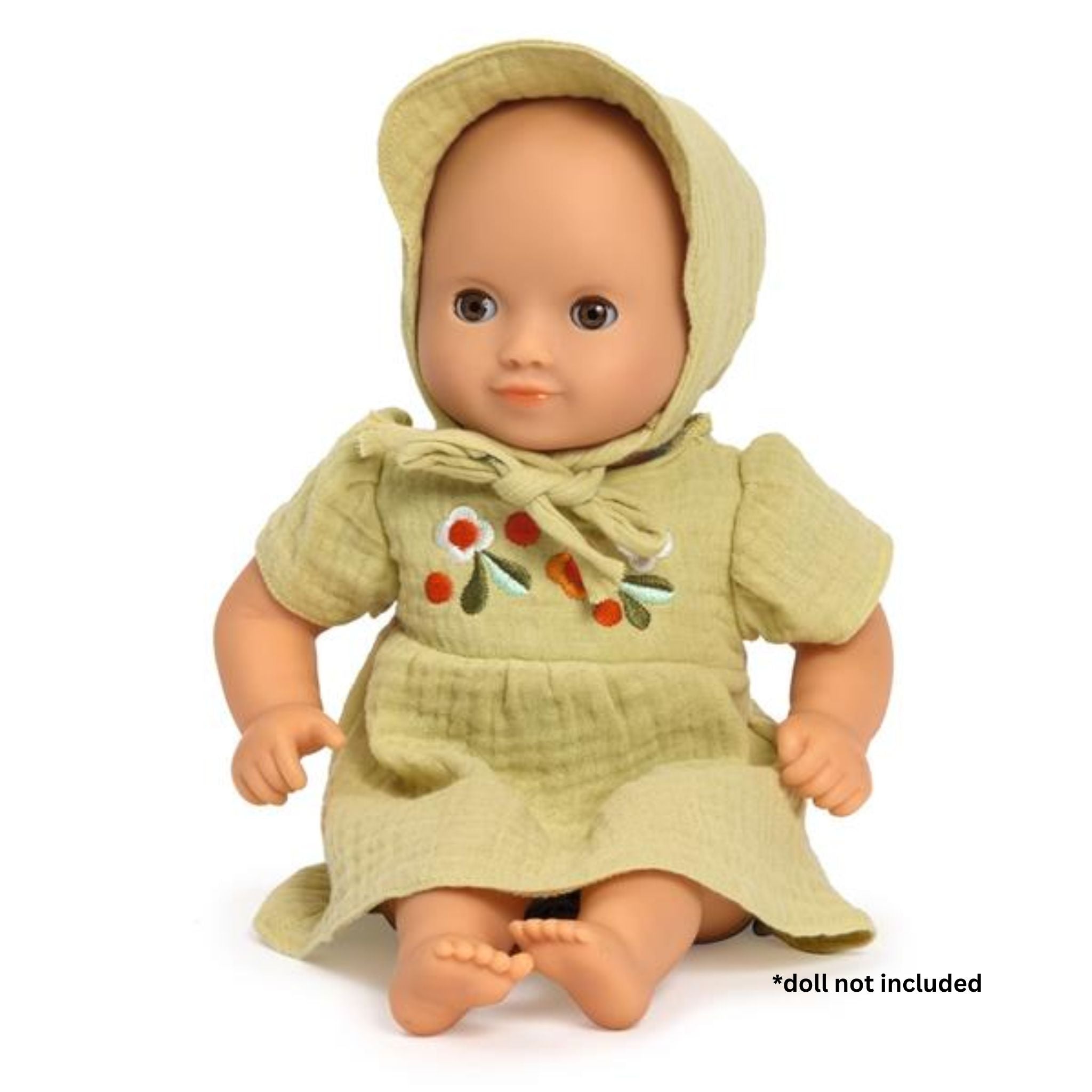 Dress your baby dolls in this adorable cotton-gauze dress decorated with colourful embroidery. The outfit includes a bonnet with a visor, to protect baby dolls from the sun.