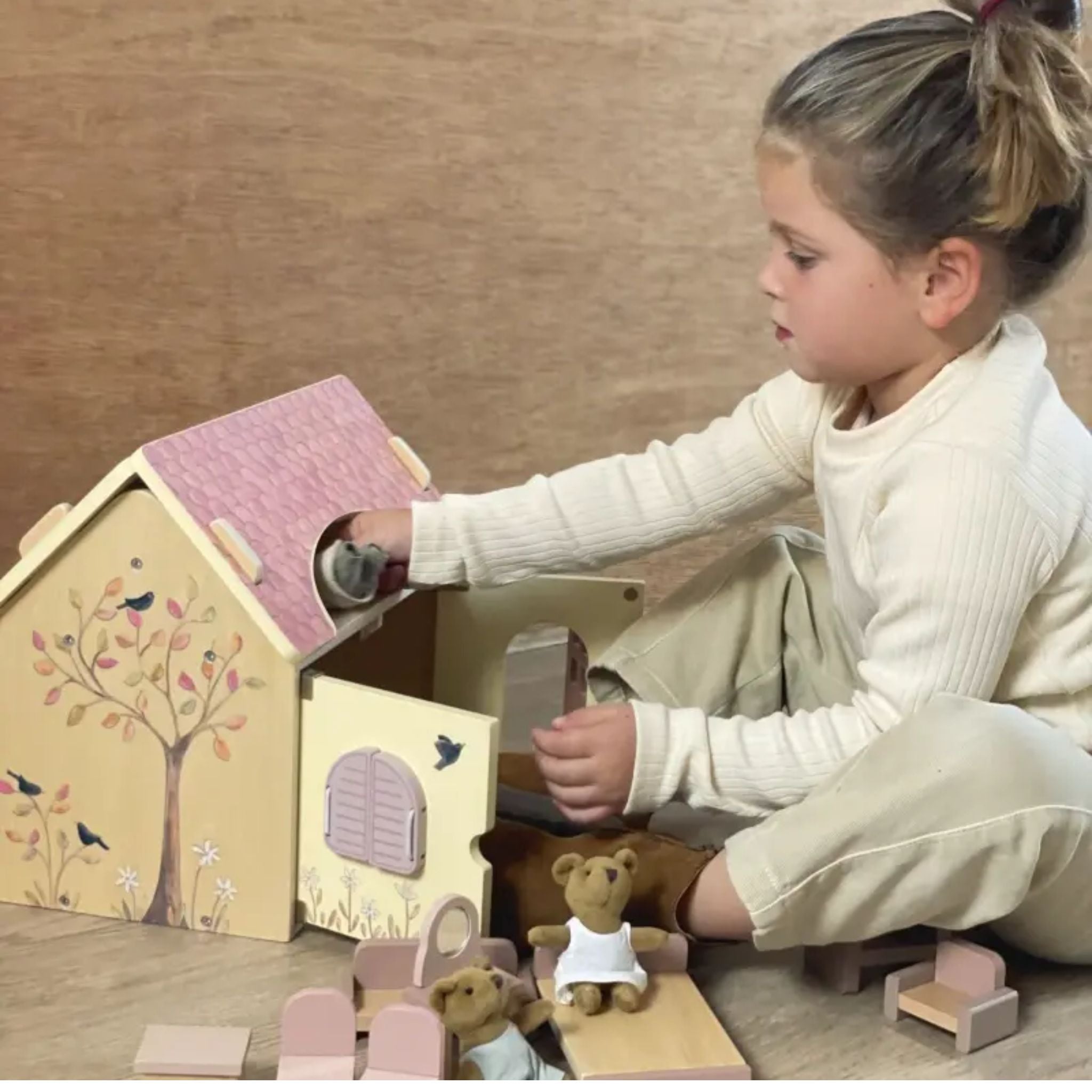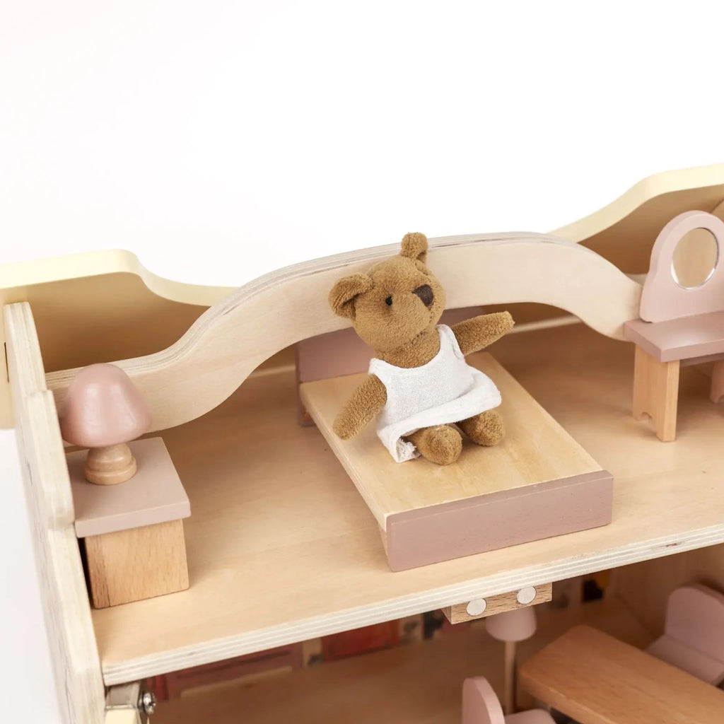Hand-painted floral details and soft pastel tones spark imagination while sturdy plywood construction ensures years of gentle play. Complete with furniture and bears, everything needed for storytelling is tucked inside.