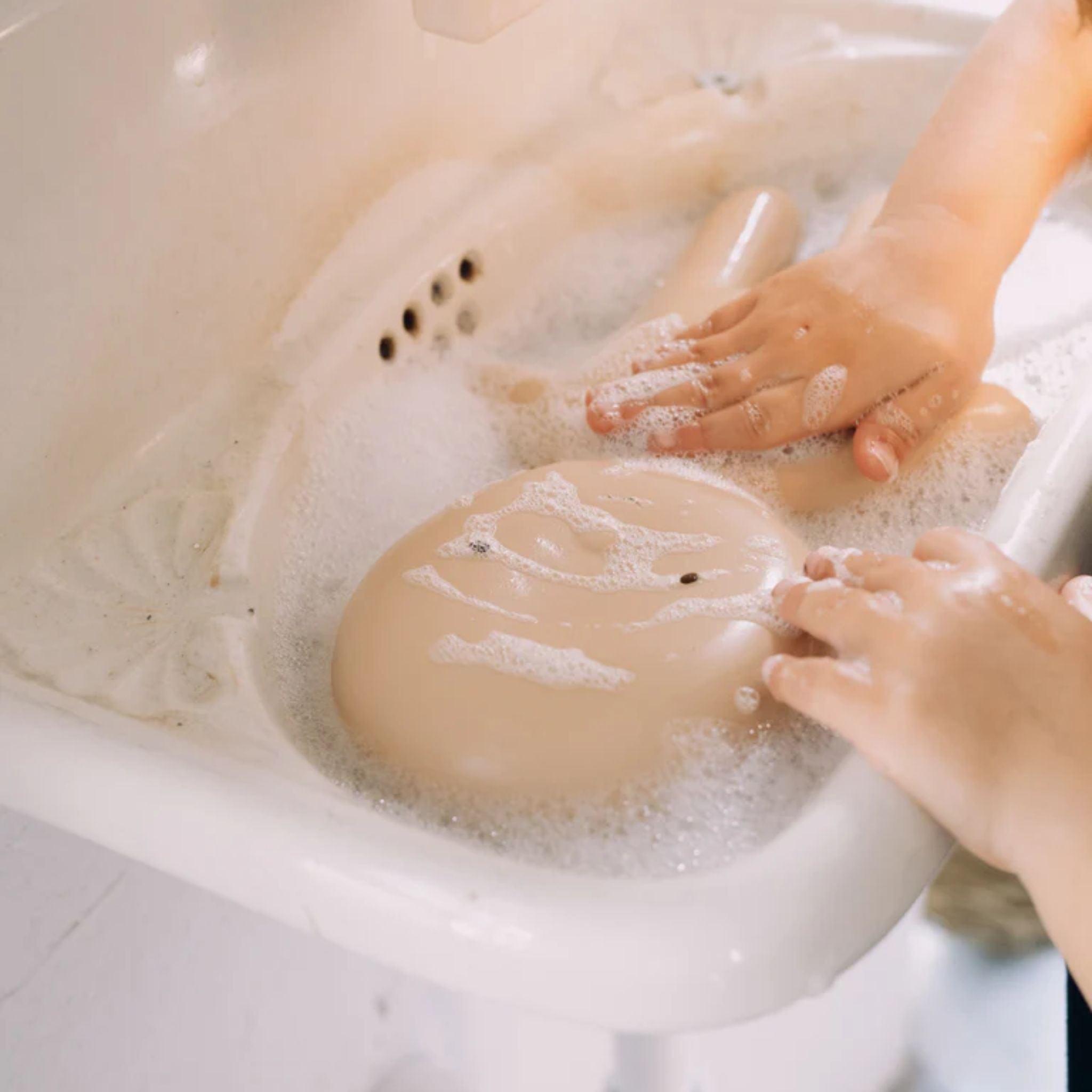 This charming doll features a body made from hevea tree white sap and is 100% biodegradable. Unique with small imperfections because it is handmade and hand painted with organic food graded paint. PVC and BPA free, soft and chewable. Safe for water play because it's hermetically sealed so no mold or bacteria can accumulate inside.