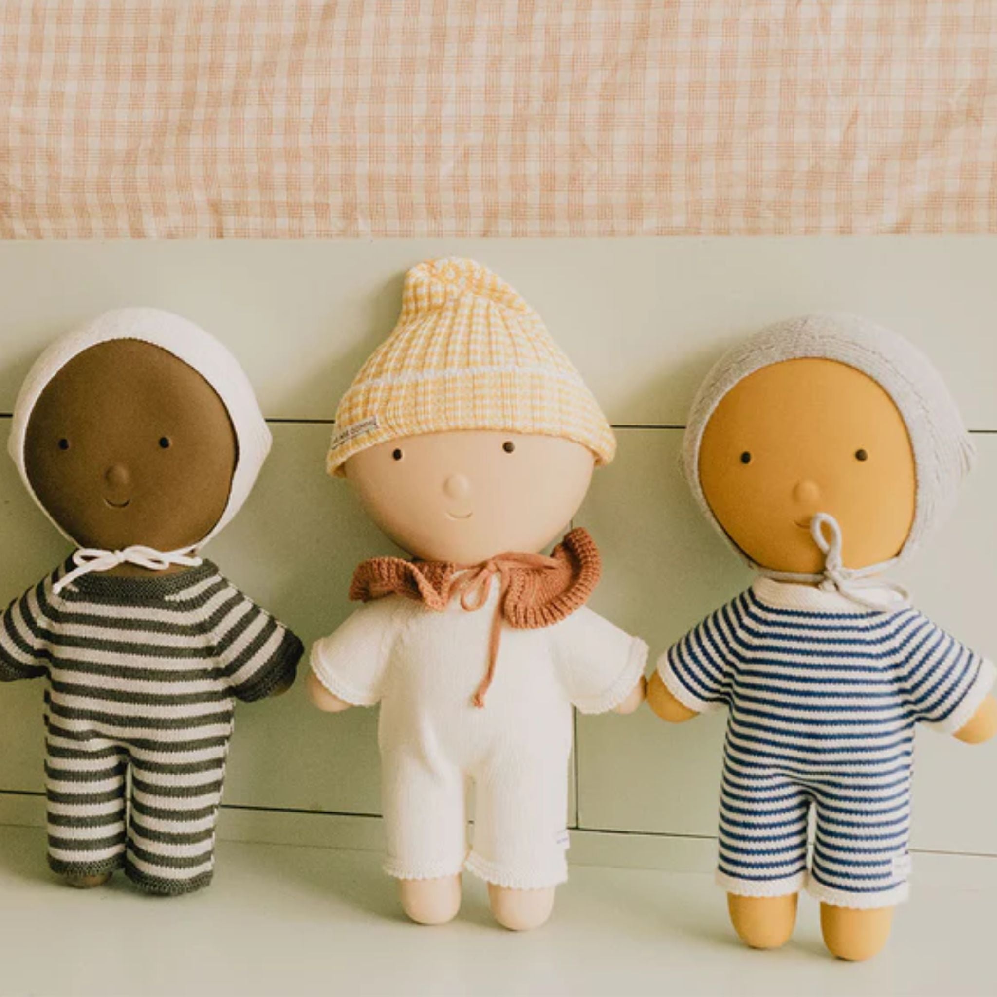 Doll comes with beige knit onesie. More outfits are sold separately.