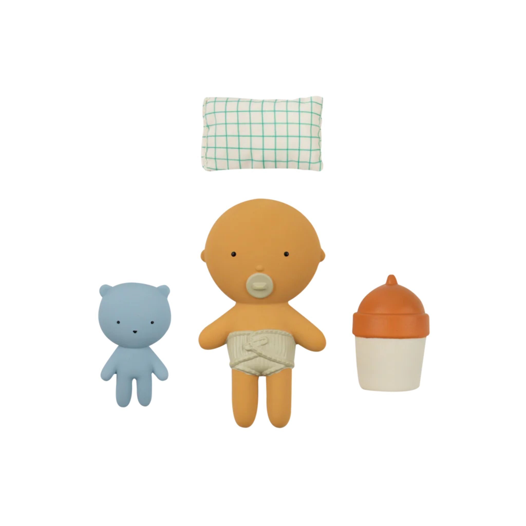 Material: 100% Hevea rubber + cotton. Size: baby 10cm, bear 6cm, bottle 5cm.