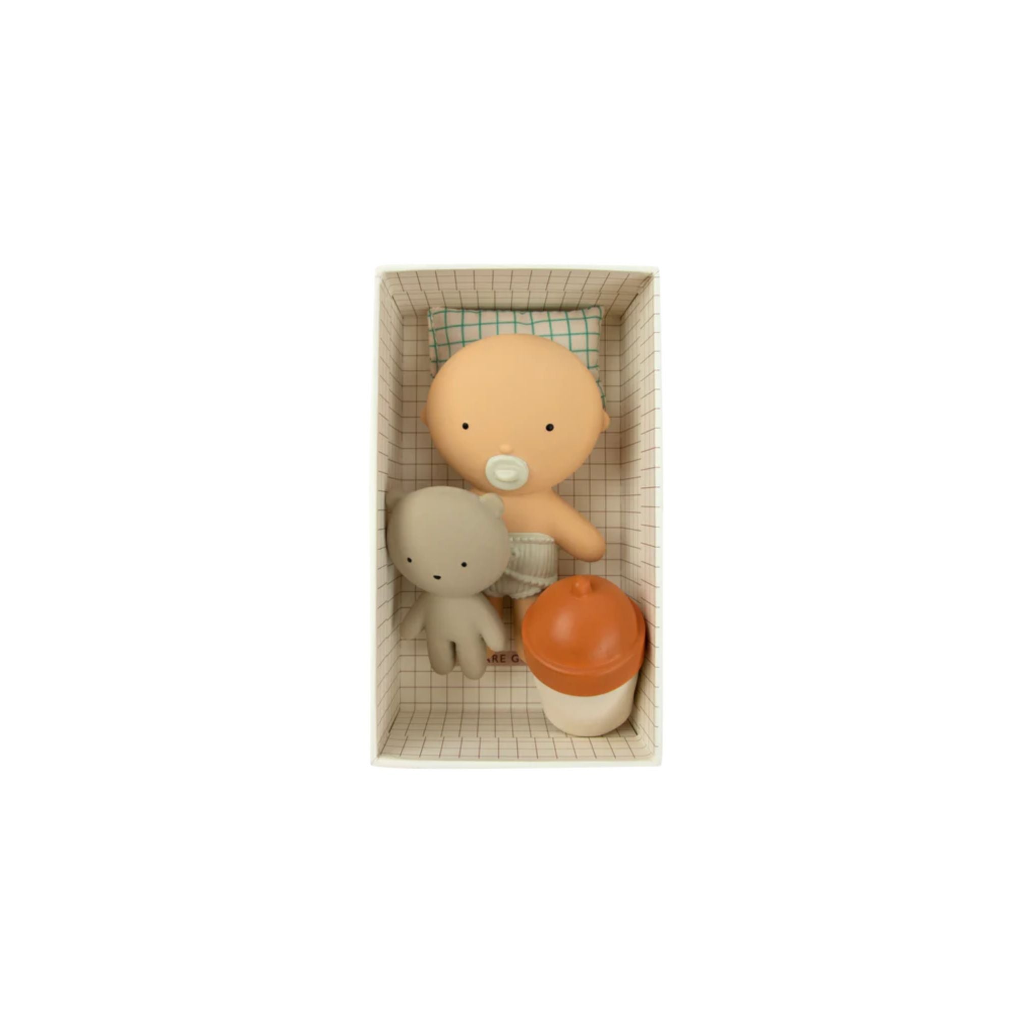 Baby Gommu in Pocket size! Baby Gommu Honey comes with its best friend bear, a bottle of milk and a cushioned pillow for nap time. Gommu loves to be in it's cardboard bed for rest and storage. Material: 100% Hevea rubber + cotton.