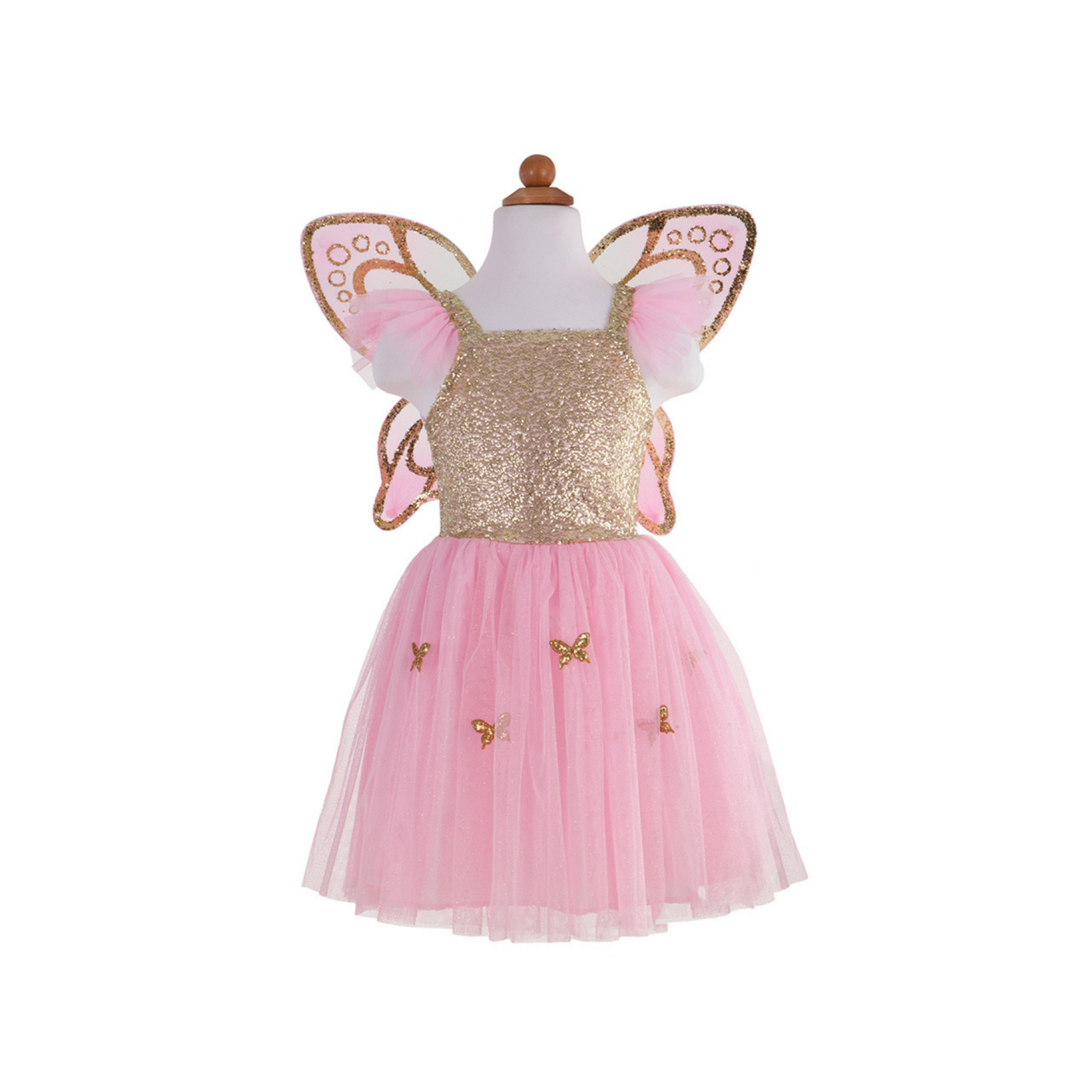 Be your own shining butterfly in this sparkly pink and gold dress. Soft pink tulle gathers for a full skirt and meets an amazing gold sequin top with tulle sleeve accents. Paired with shimmering gold dusted glitter printed wings, this two piece dress wing combo is sure to delight. Ages 5-7 years