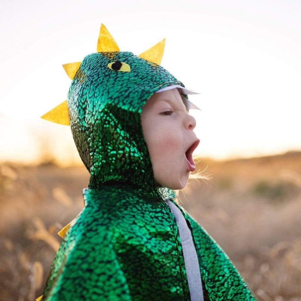 This cape features luxurious fabric with a metallic dragon scale skin texture and felt stand-up spikes down the centre back ending in a cute foam-backed tail. Eyes and spiky teeth accents on the hood make a fearsome disguise! The Velcro closure at the neck means this cape is easy to put on and take off. Fits most 2-3 year-olds.