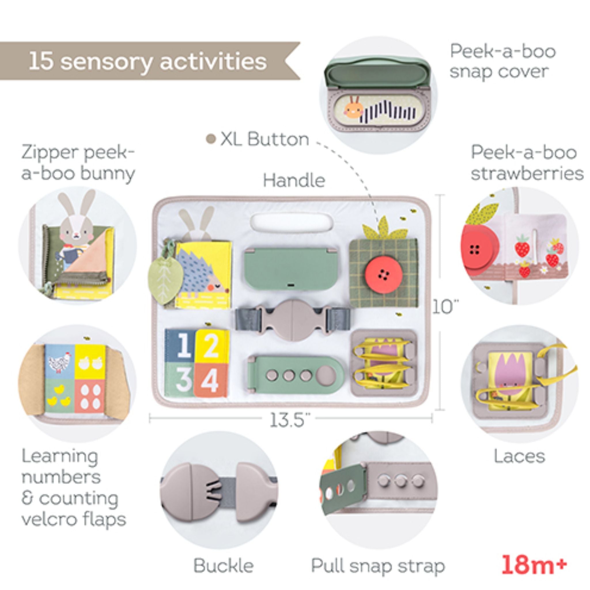 Activities include: zipper, XL button, Velcro flaps, laces, snap cover, buckle, pull snap strap, peek-a-boo activities, numbers, amounts, and counting.