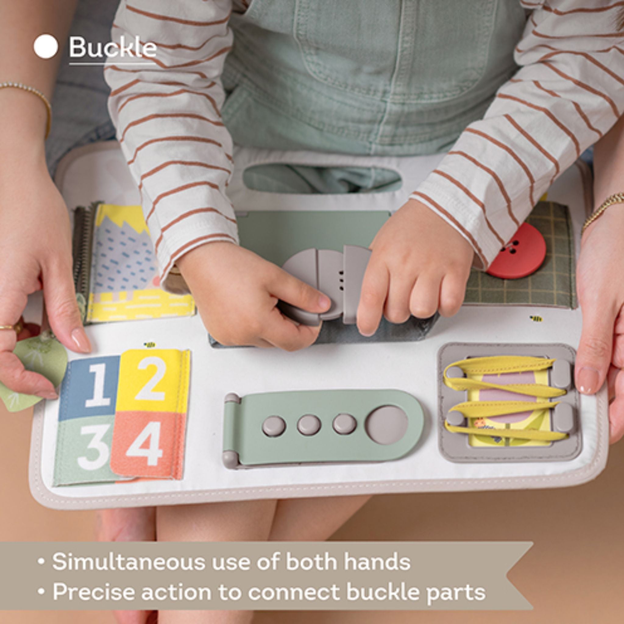 Buckle: helps toddlers practice their problem-solving skills and hand-eye coordination as they learn to fasten and unfasten the buckle.