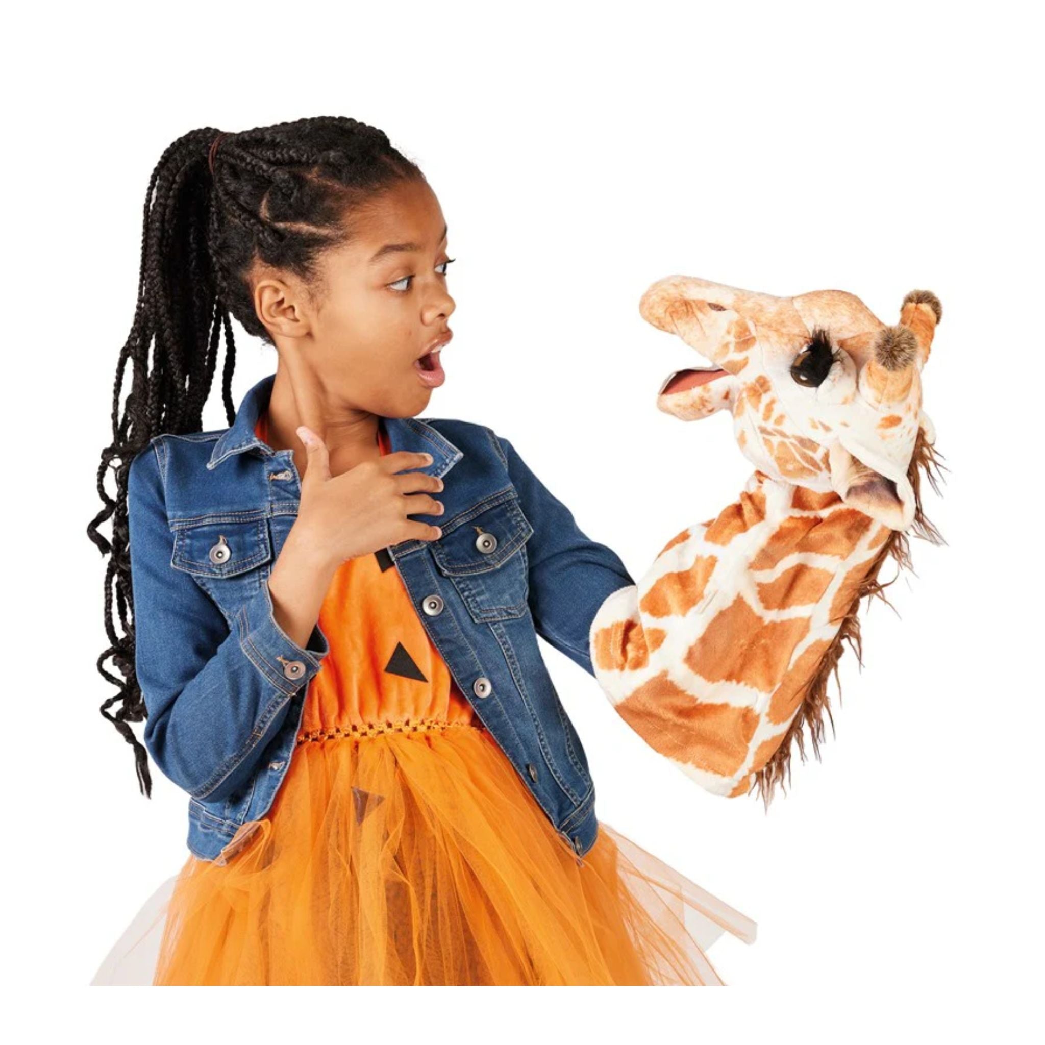 Reach for the heights of your imagination with the quintessential Giraffe Stage Puppet. This graceful animal rises above with a long neck printed in signature patterned velour with plush accents, luxurious long lashes, and a movable mouth.