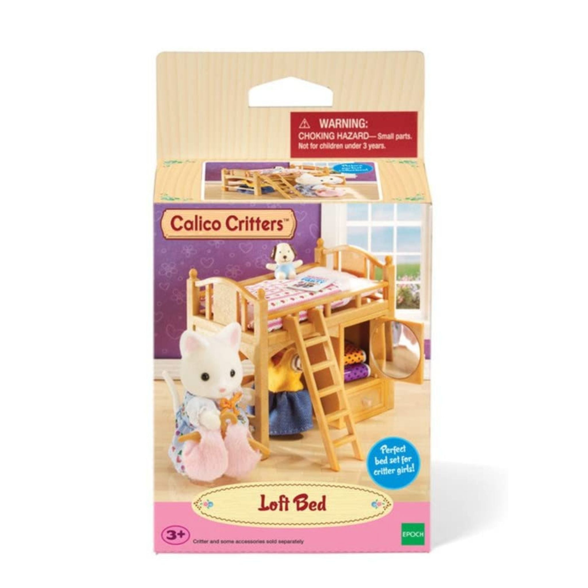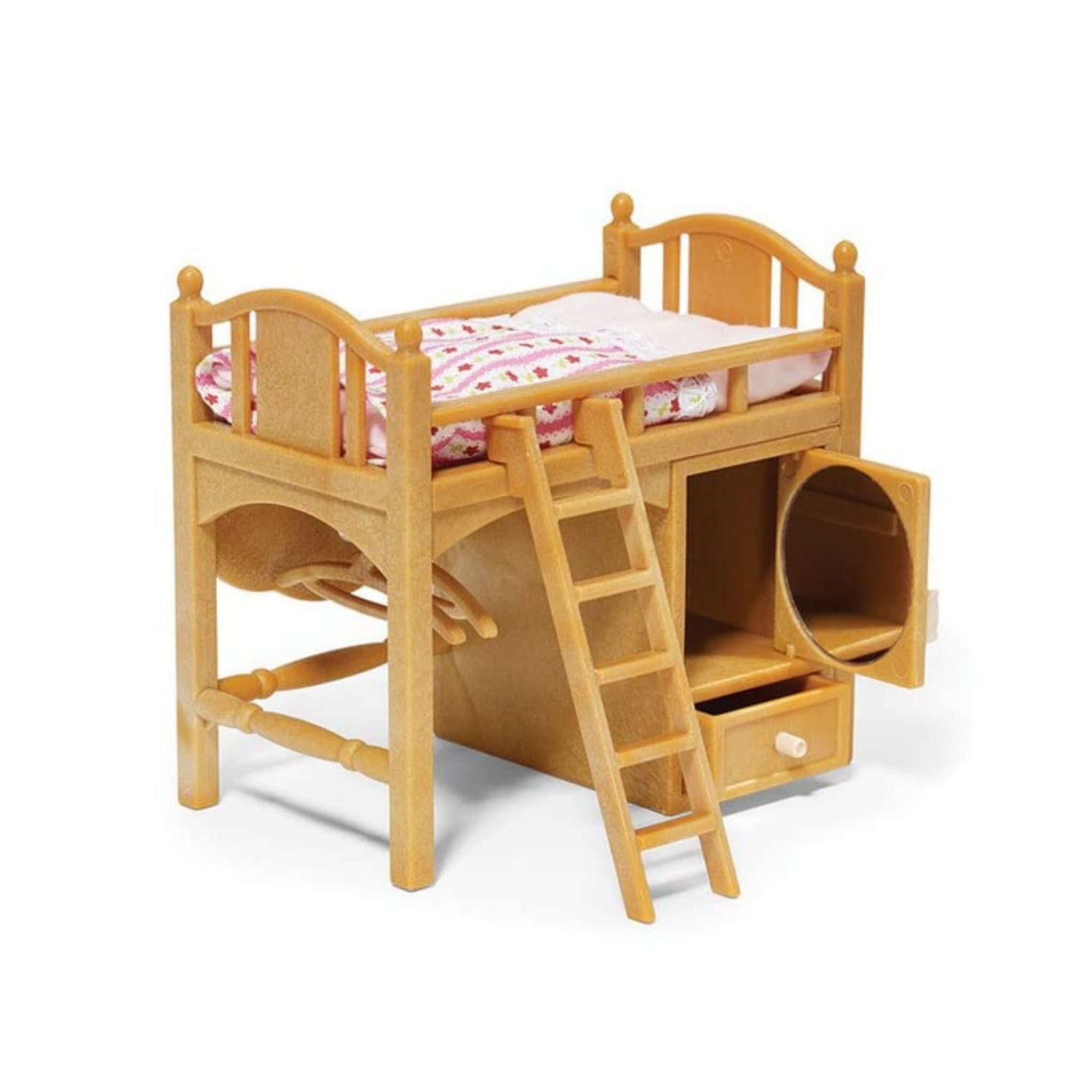The Calico Critters loft bed is perfect set for your critters. Includes: bed, mattress/pillow, blanket, built-in cabinet with mirror, storage drawers clothes hanging rod, hangars and removable ladder.