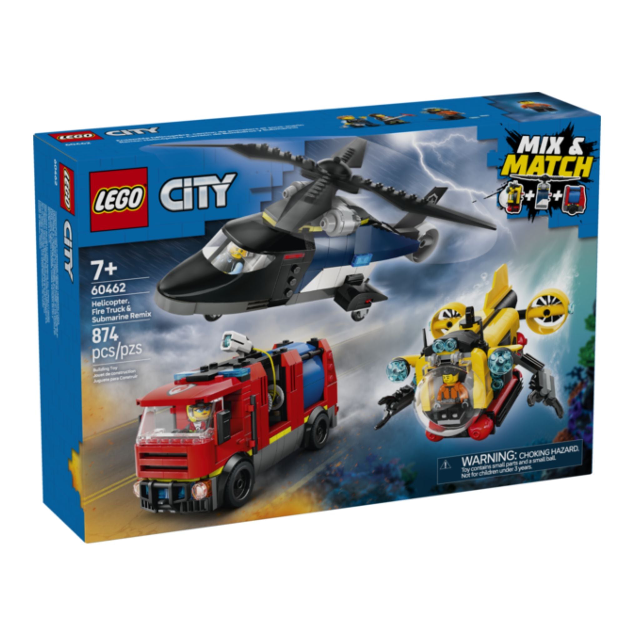 Kids who love to build and create will love the LEGO® City Helicopter, Fire Truck & Submarine Remix toy playset (60462) for ages 7 and up. This 3-model building set includes a police helicopter with spinning main and tail rotors, an exploration submarine with a bubble cockpit and posable claw arms, and an iconic fire truck with an extendable hose. Each model comprises 3 modular parts that can be combined, allowing kids to mix and match an array of action vehicles ready for exciting missions. Just add the police officer, helms person and firefighter minifigures and let the fun begin!