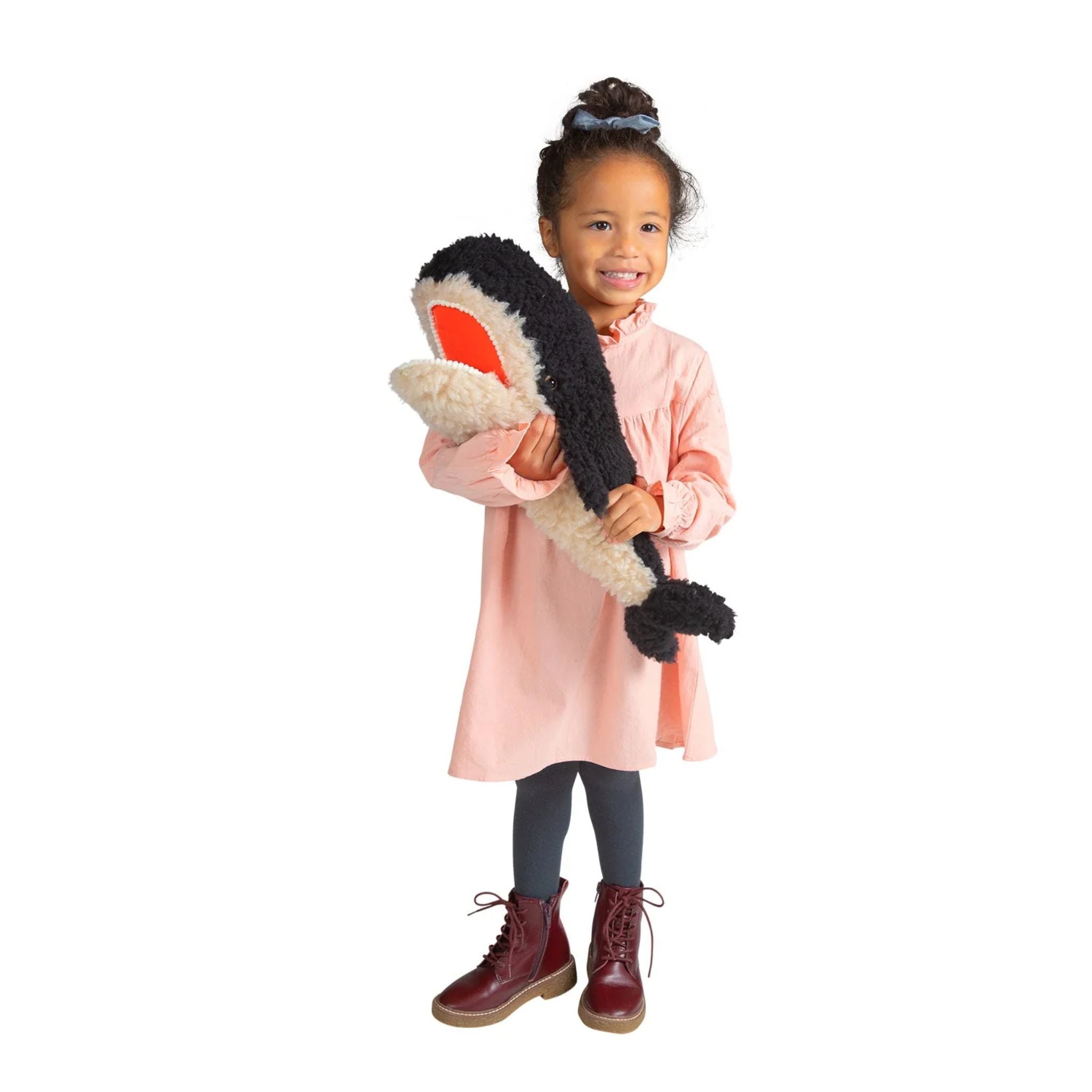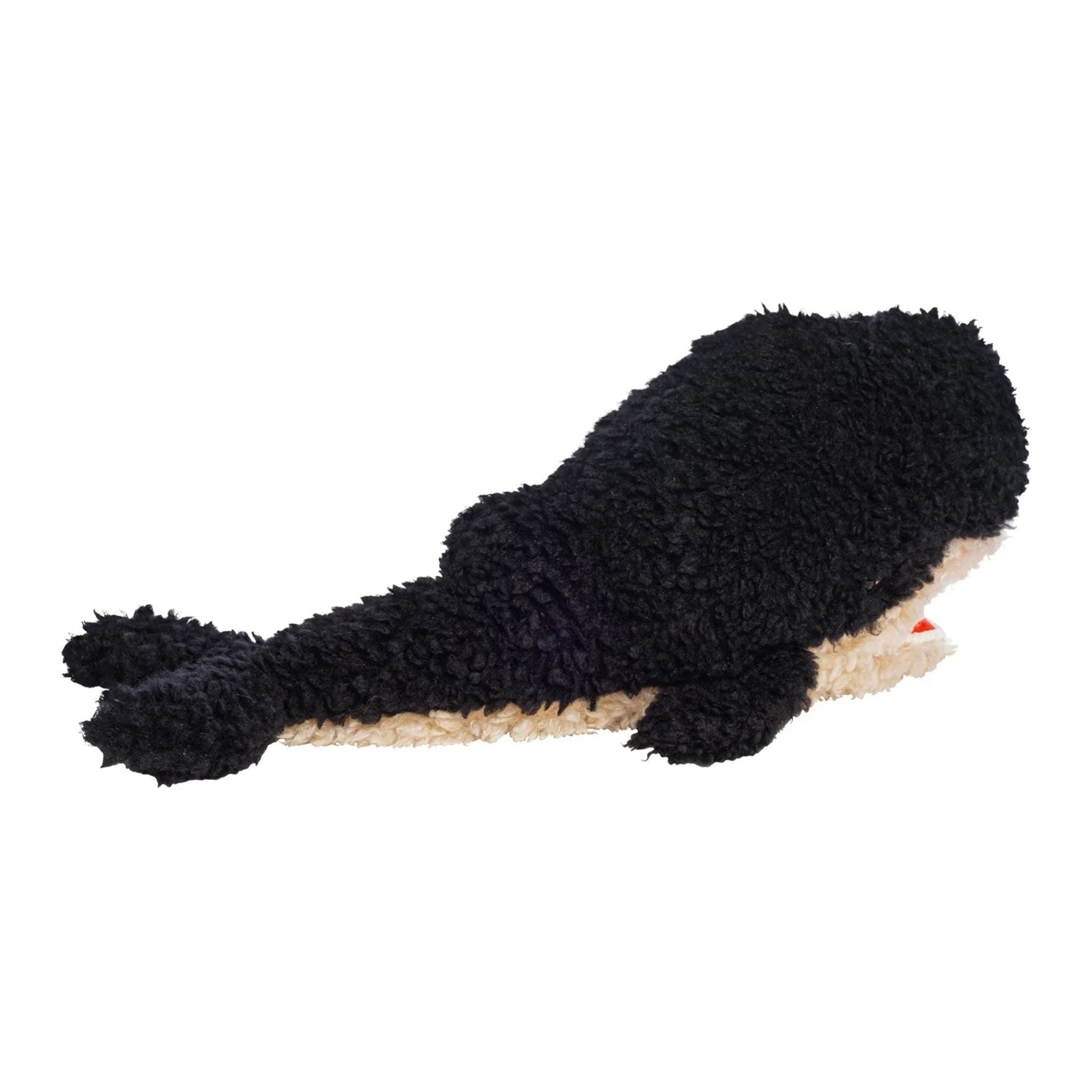Covered in a variety of luxurious fabrics and textures, this oversized whimsical whale is irresistibly soft and satisfyingly squishy. Its understuffed design makes it extra snuggly, while the floppy tail, poseable mouth, and tongue add depth and interest.