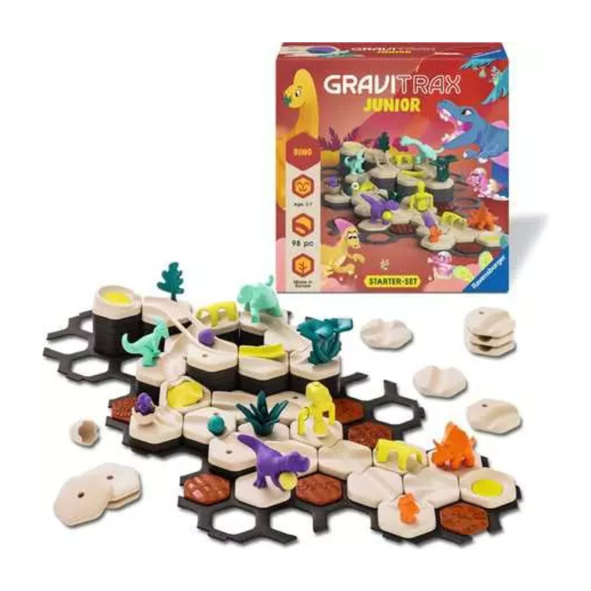 With the GraviTrax Junior Starter Set L Dino, kids can immerse themselves in the world of dinosaurs. The set contains everything to start building right away. With a variety of dinosaur figures and elements from the world of dinosaurs, children can experience the world of dinosaurs up close. Exciting components such as tunnel curves, a switch, a 3-in-1-curve and crossings make the building fun perfect.