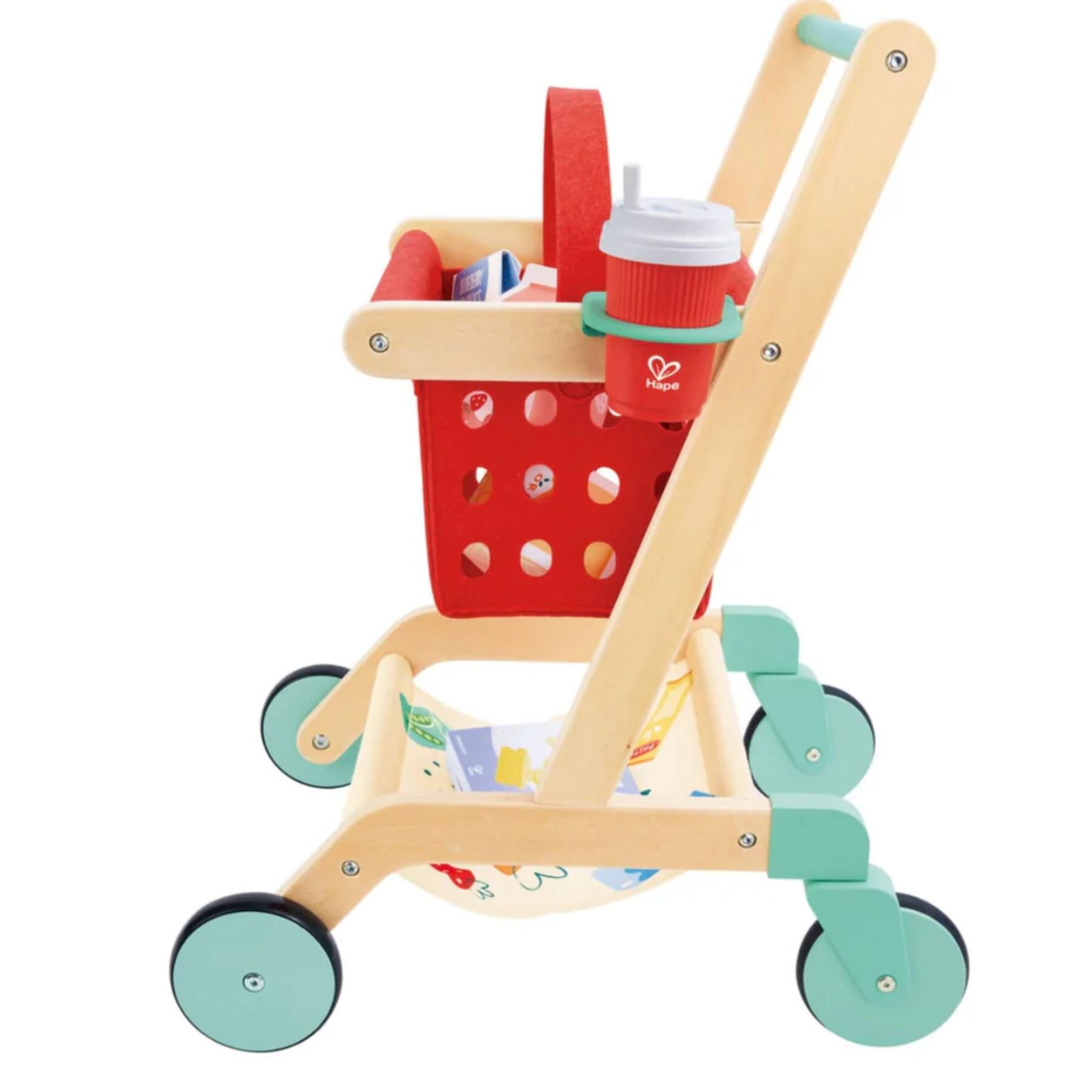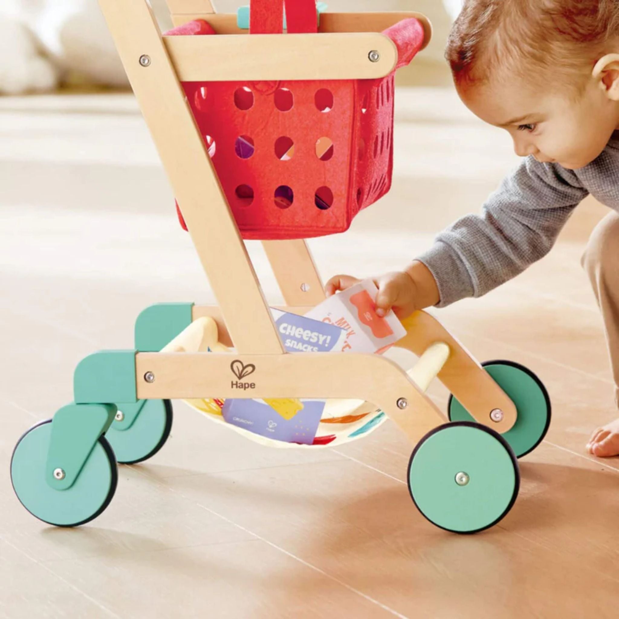 This colourful wooden shopping trolley, designed with easy-rolling wheels and a sturdy frame, is perfect for pretend play, collecting toys, or creating a mini market right at home.
