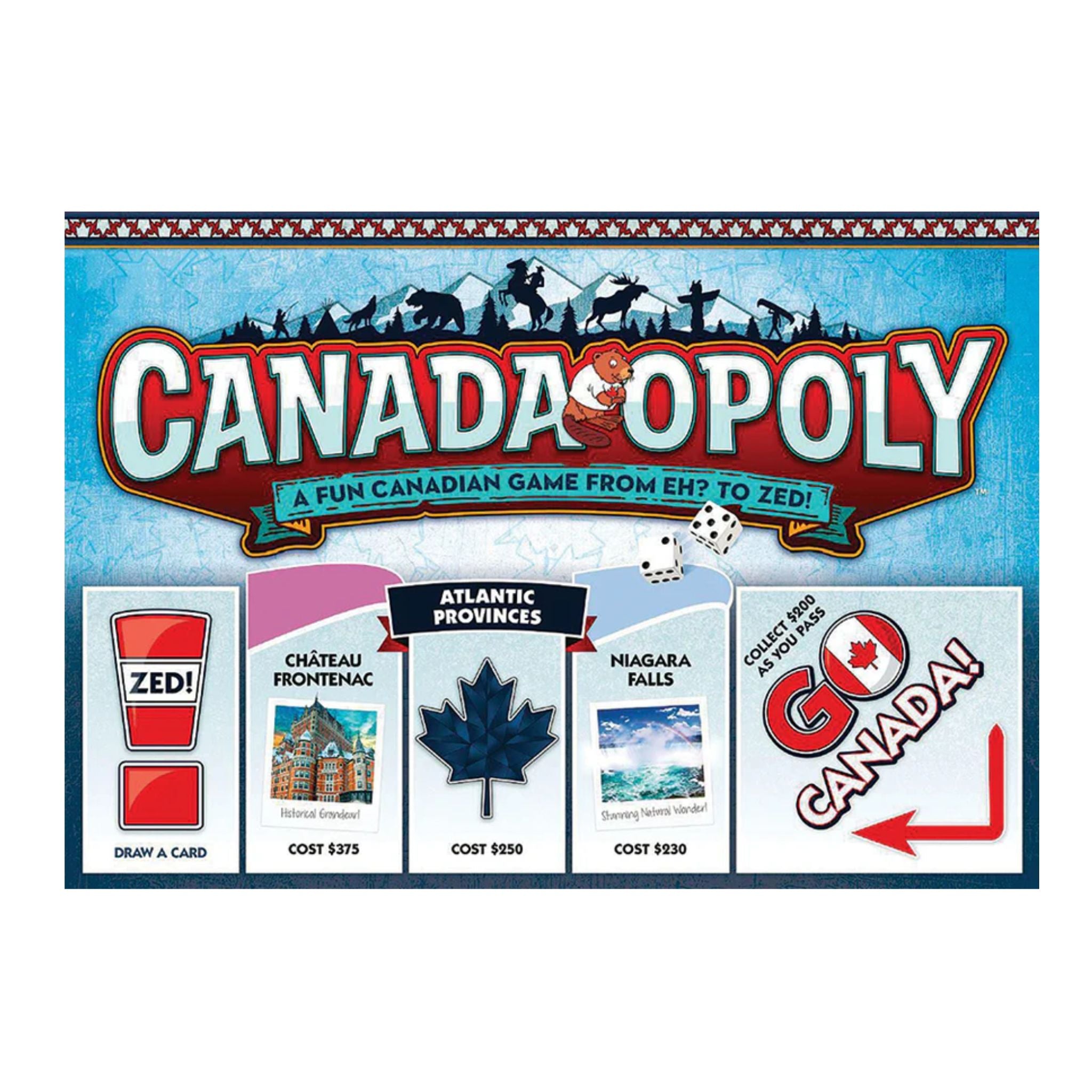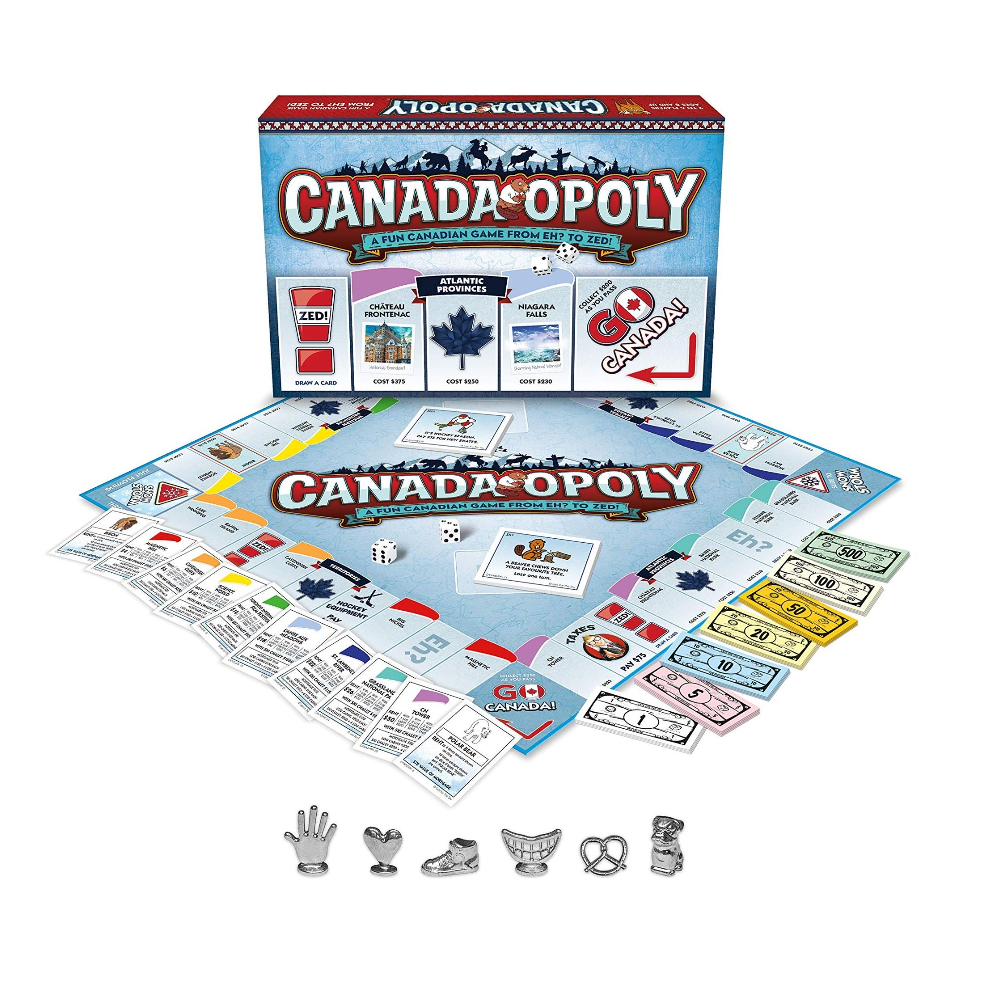 Ever imagine owning the CN Tower? Or maybe Niagara Falls? Here's your chance! Canada-Opoly is a property trading game designed for hockey loving, maple-syrup chugging, board game adoring Canadians. Buy your favourite Canadian property then collect log cabins and trade them in for ski chalets. Sounds easy enough, but add a snow storm, and an angry moose and it becomes a little more difficult and a lot more fun!