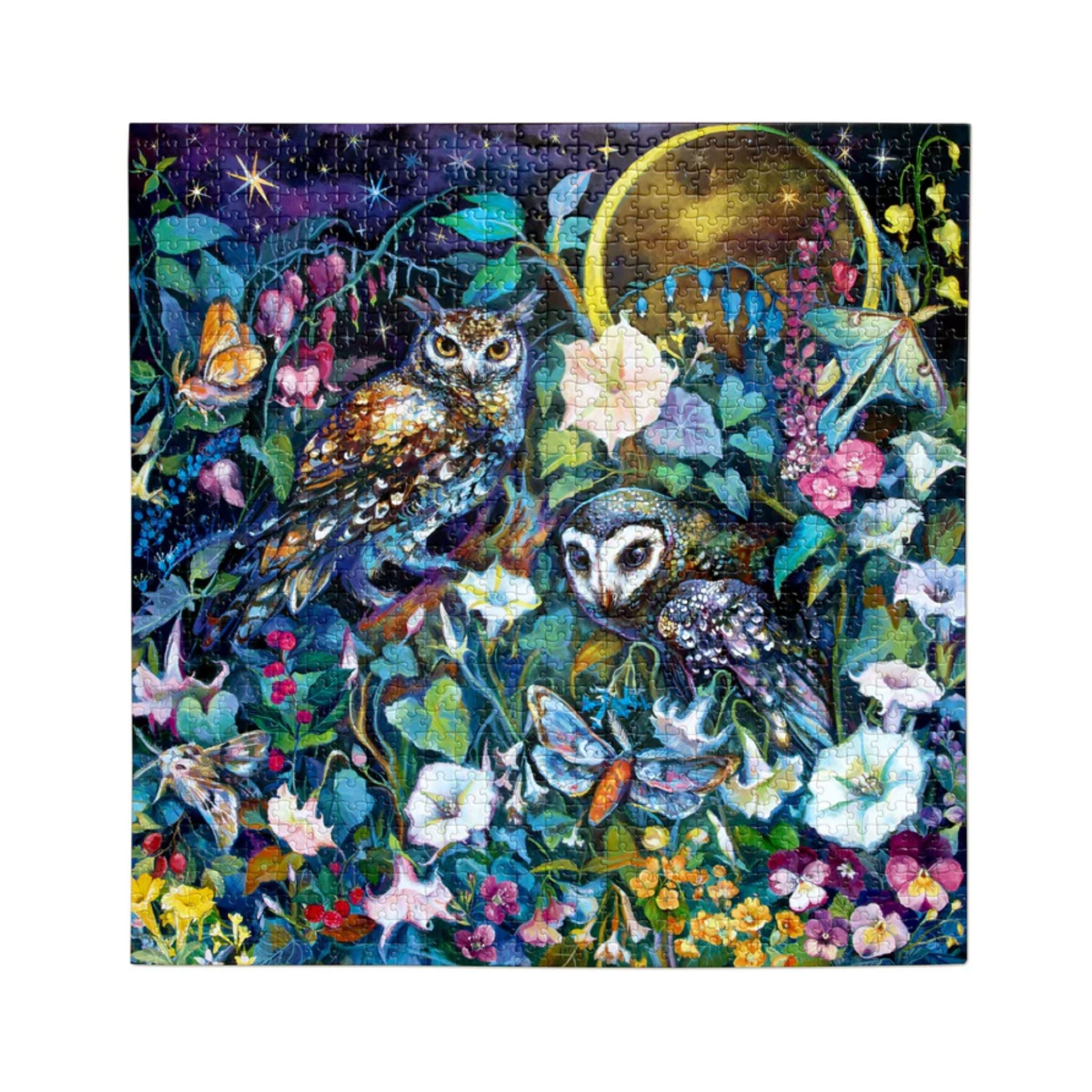 Artist Clara McAllister imagines a pair of owls conferring in a gleaming moonlit garden full of broad leaves and blossoms. 1000 sturdy, dustless, double-coated puzzle pieces that snap together with ease. Includes a full-colour insert for reference.