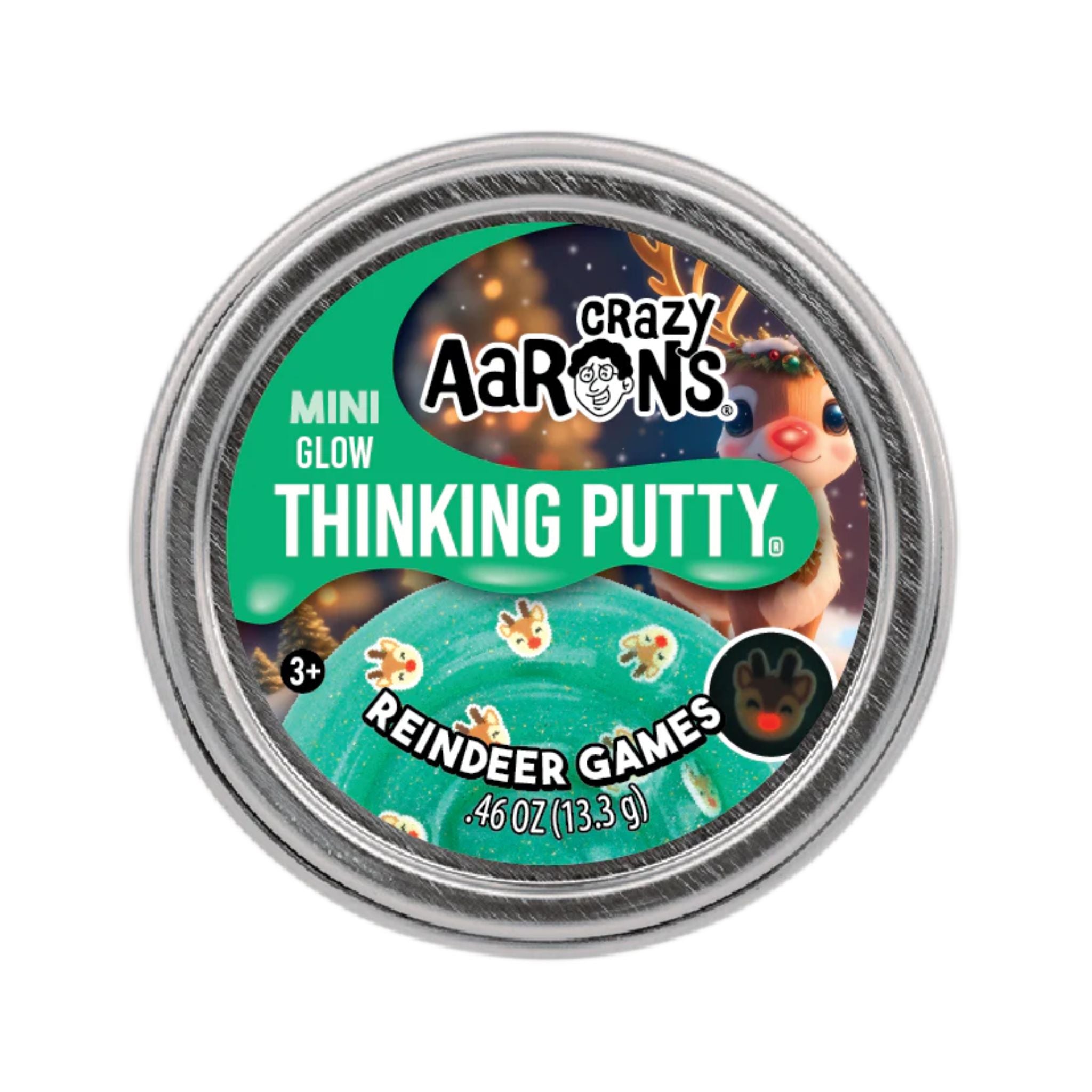 Everyone can join in on the fun of Crazy Aaron's Mini Reindeer Games Thinking Putty! This merry green putty shimmers with golden sparkles and playful reindeer clay pieces. And for a magical surprise—turn off the lights and watch their noses glow bright red!