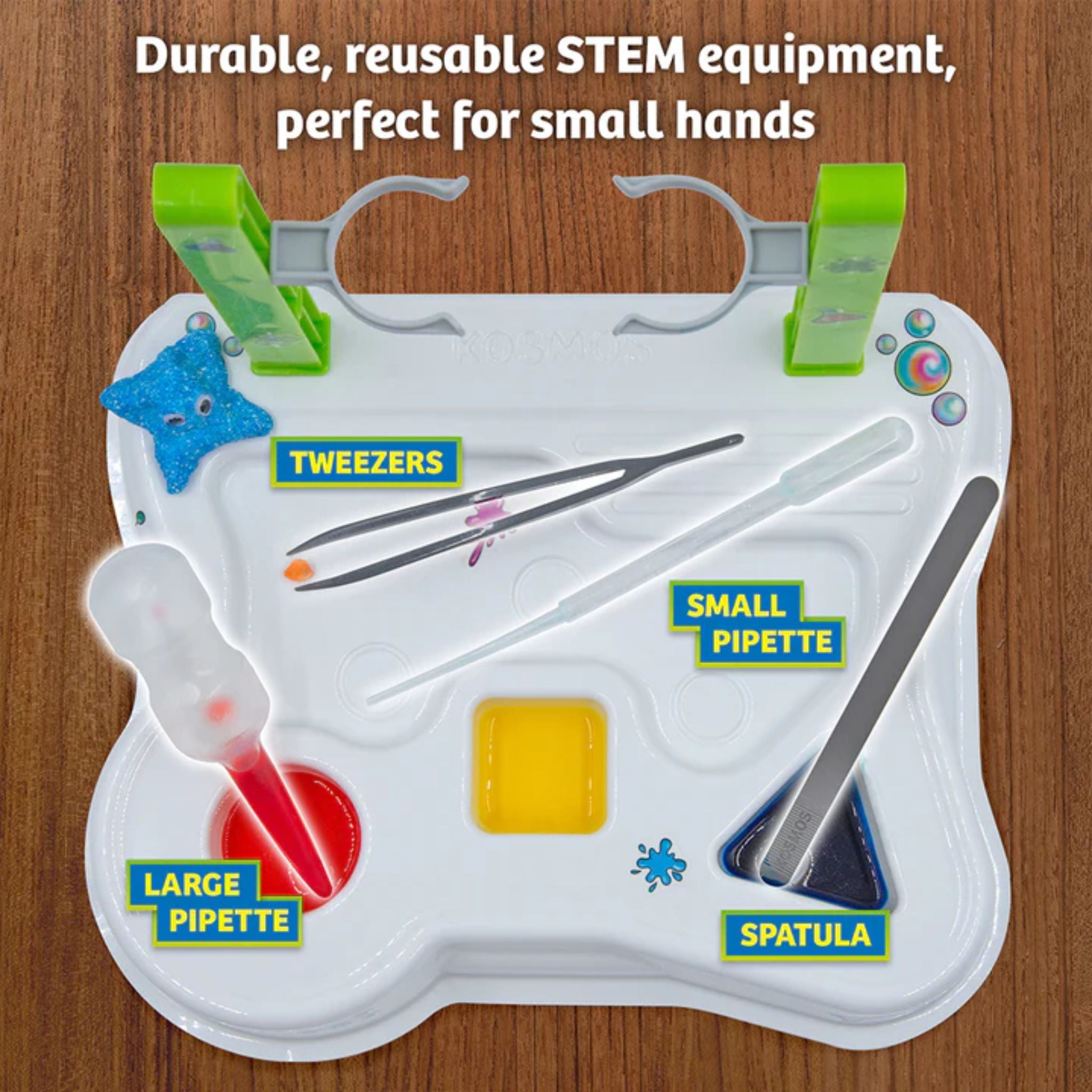 The durable plastic base station creates a dedicated workspace and provides a home for the pipettes, tweezers, spatula, test tubes, and other tools and equipment included in the kit. A 28-page, full-color manual brings each experiment to life with colorful illustrations, step-by-step instructions, and simple explanations of the amazing principles at work.