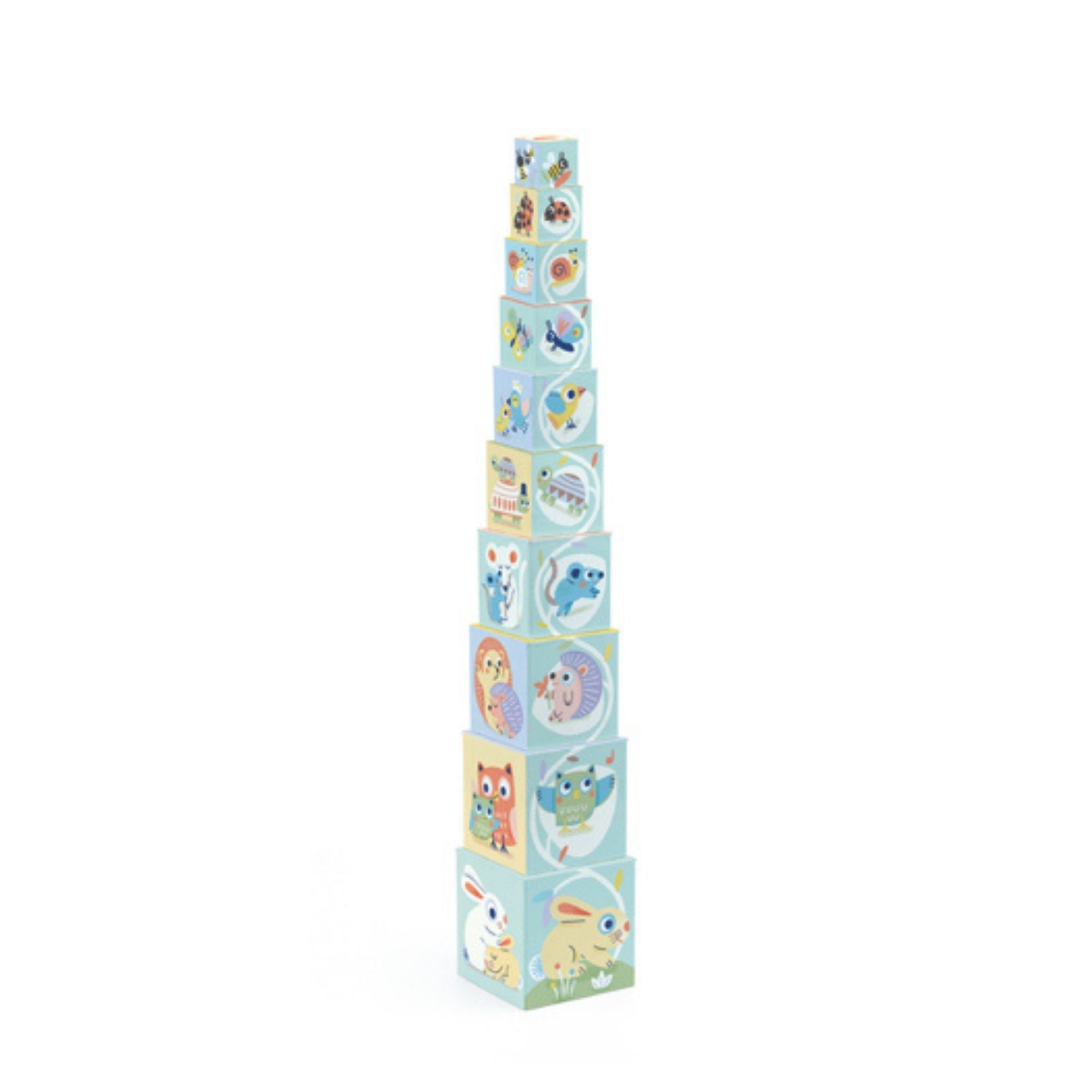 A set of 10 stacking cubes for young children featuring numbers 1-10 on one side, animals and designs on the others.