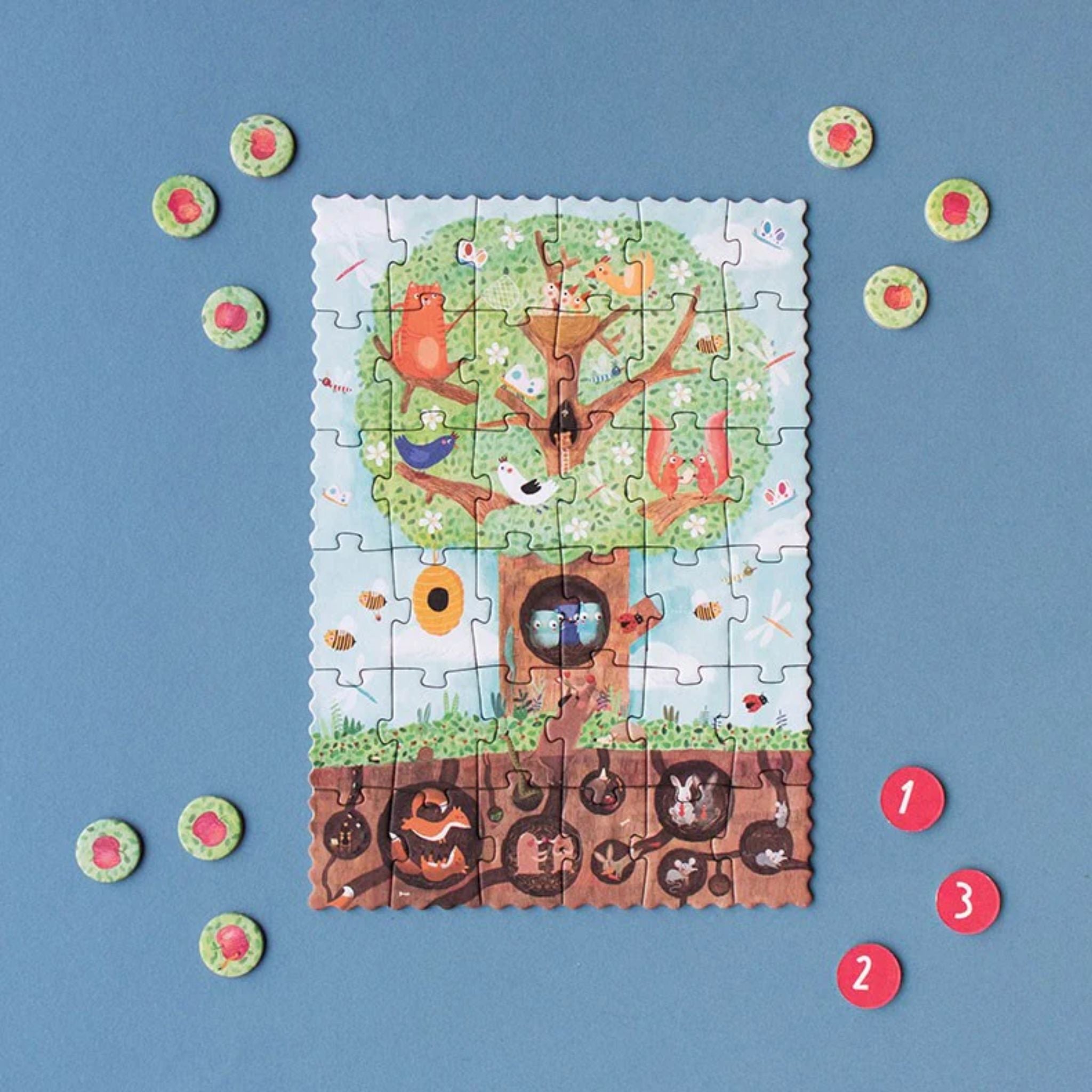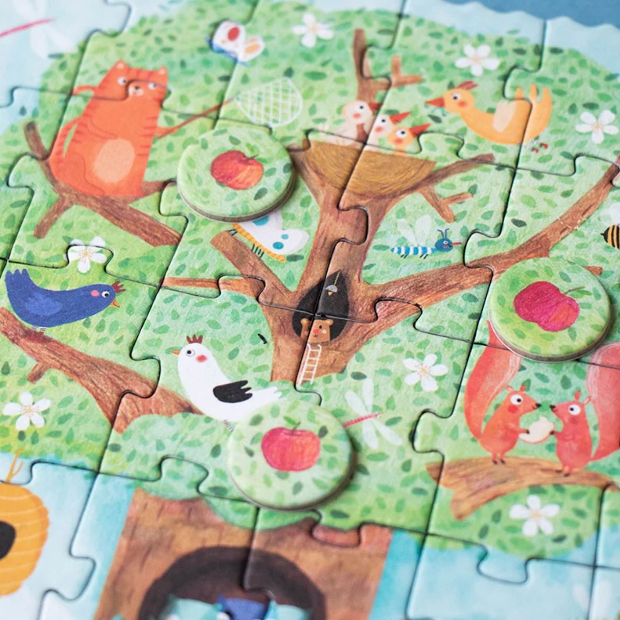 The apple tree is bursting with life. It hosts a famly of squirrels, a nest of baby birds, a mischievous cat and playful owls. Underground mice, rabbits and moles hide in their burrows. Once the puzzle is assembled look for all of the apple tree's blossoms that will turn into apples and learn to count while having fun.