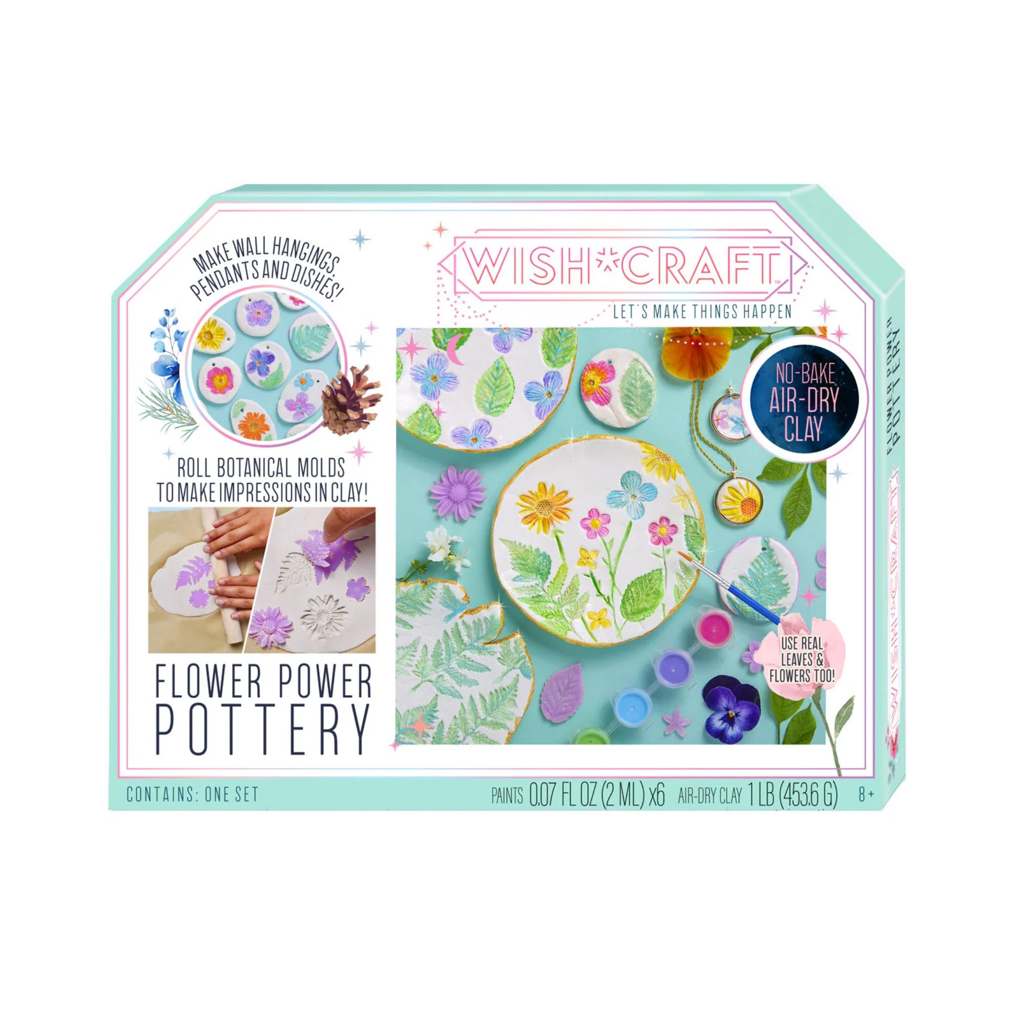 Includes: 1 lb of moldable clay, wooden rolling pin, seven detailed botanical stamps, stencil, six paints, glaze, paintbrush, four jewelry pendant sets with clasps, bowl mold, and wall art rod with gold floss.
