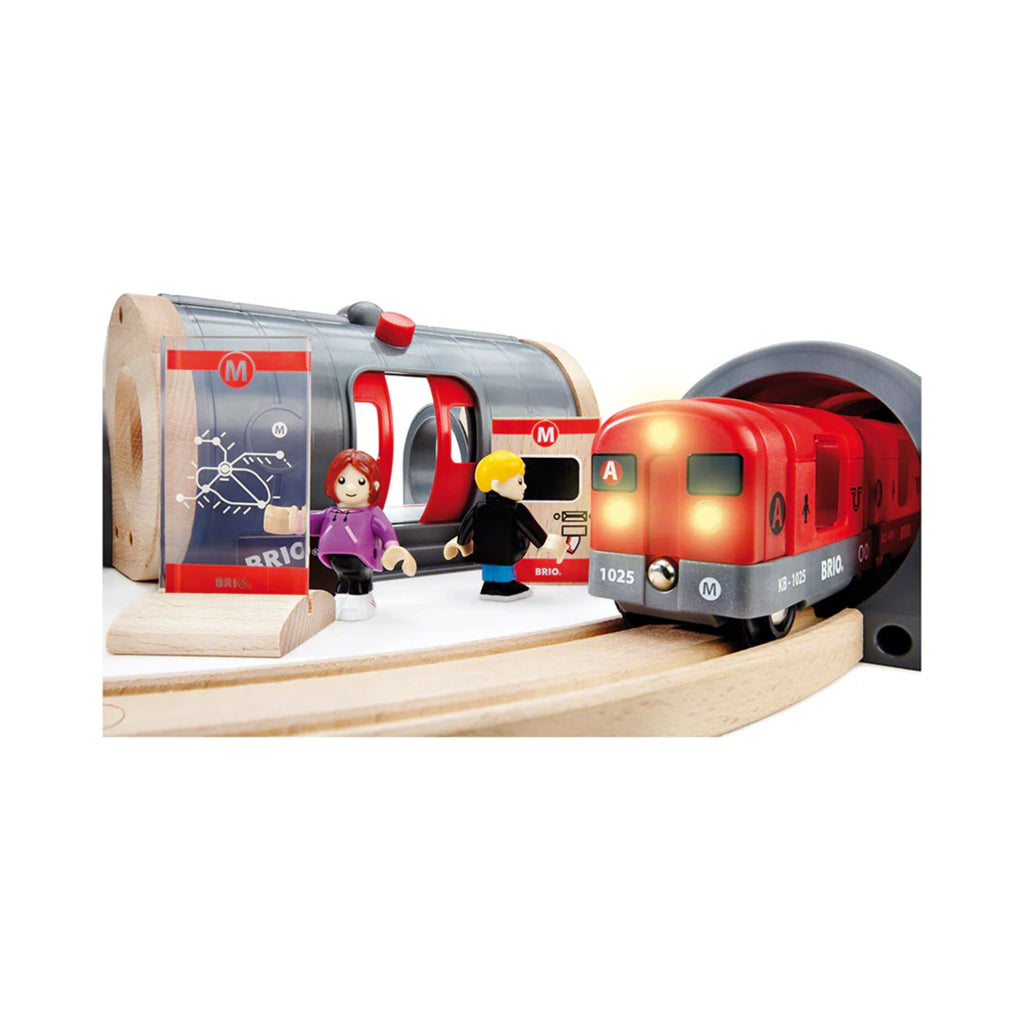 This 20 piece set has a light and sounds train engine, two passenger cars with sliding doors, detailed Metro Station, tunnel, ticket kiosk and Metro map, 8 track sections, special switch track, two Brio characters and a suitcase. Connects to all BRIO trains and the BRIO wooden railway system.