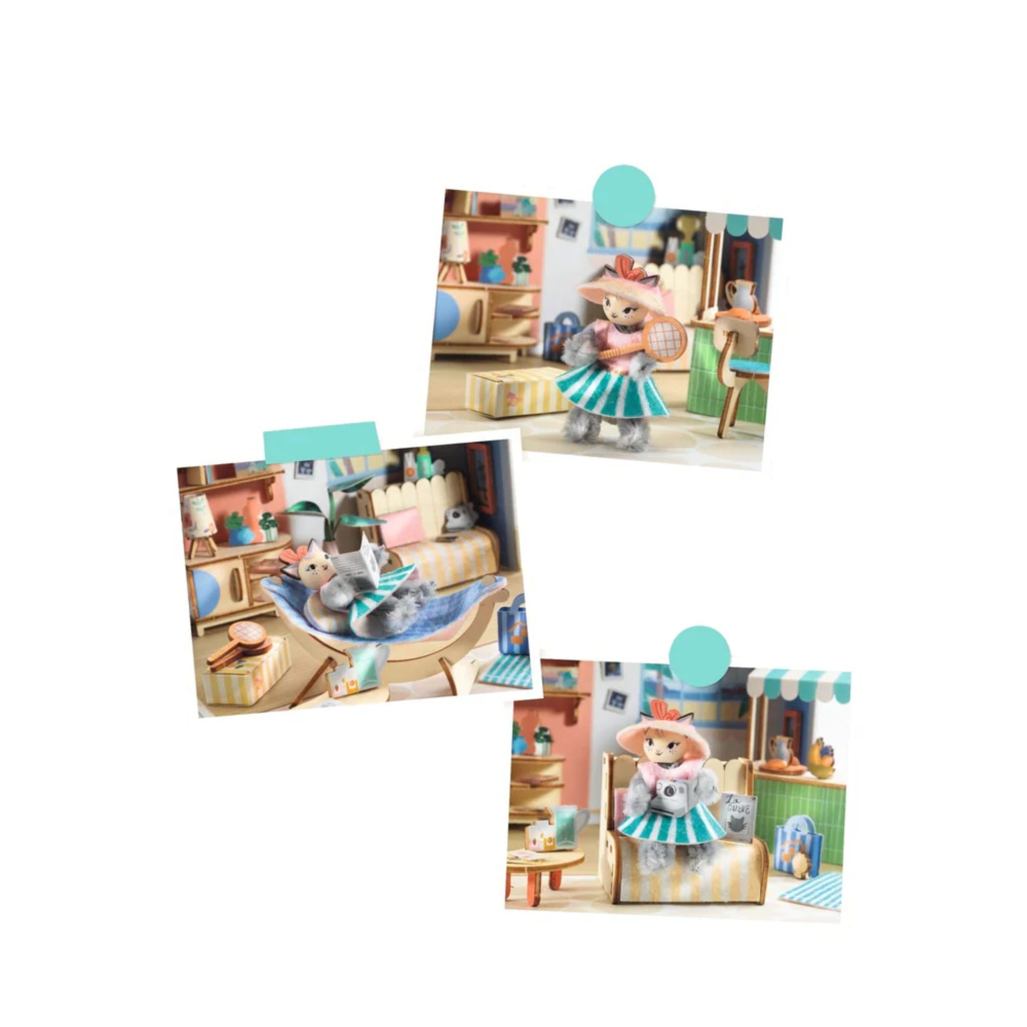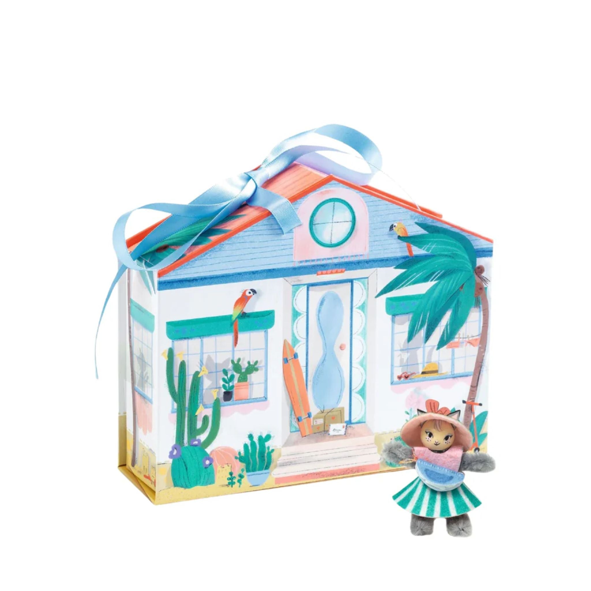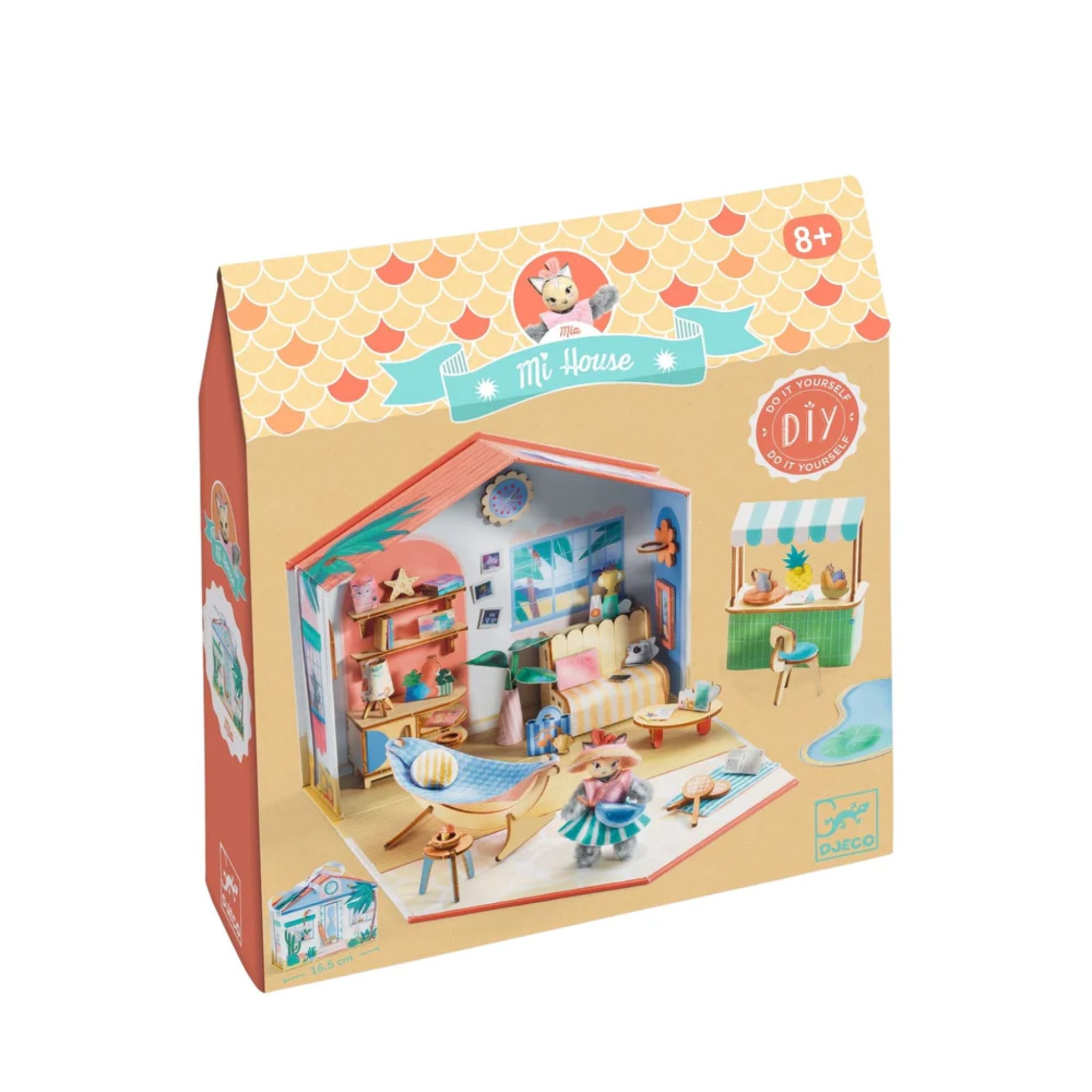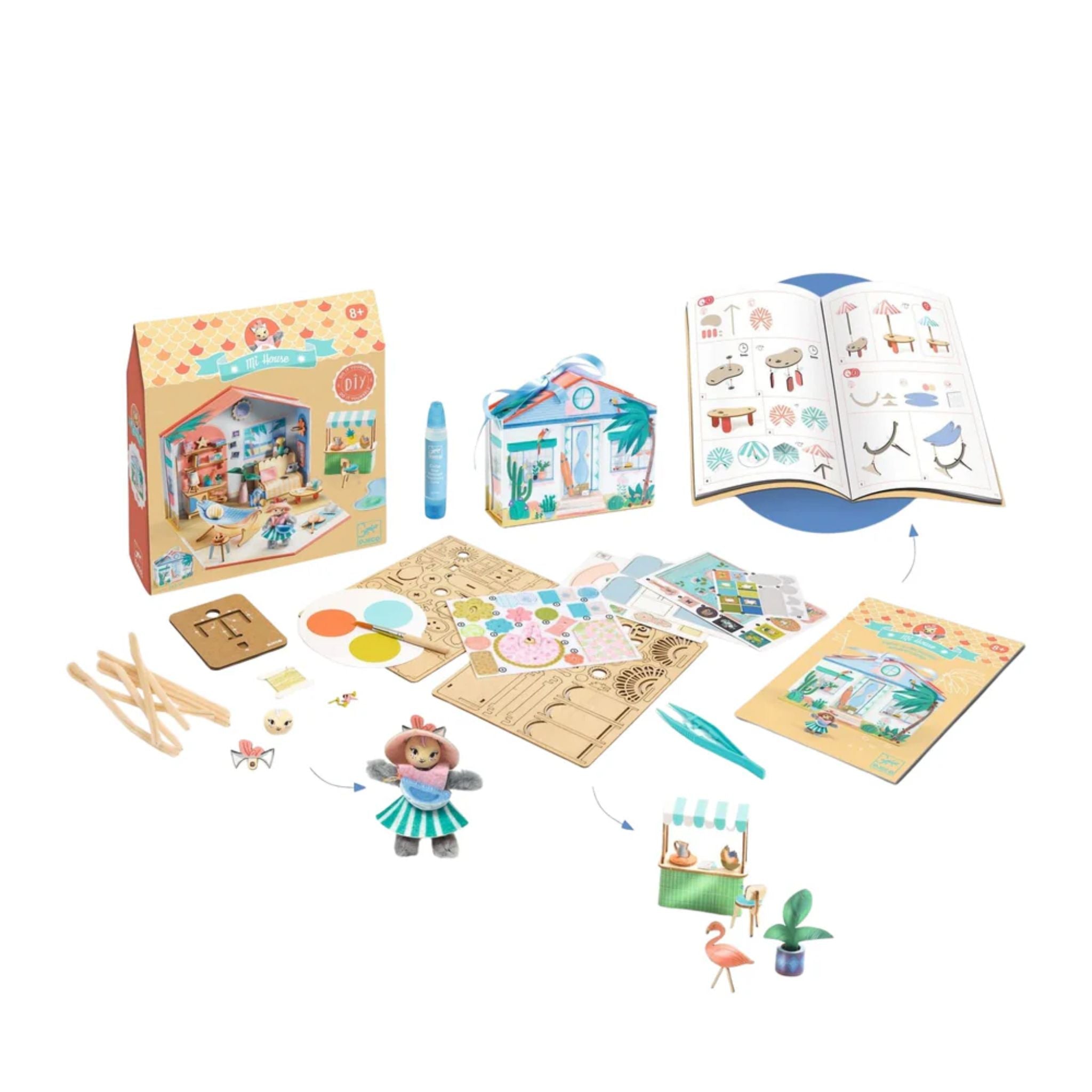 Includes: 1 little house (closed size: 14.5 x 16.5 x 5 cm), 2 glazed wooden boards, 1 palette of dry paints and 1 paintbrush, 1 protective tablecloth, 3 sheets of pre-cut illustrated card, 3 sheets of stickers (1 sheet of illustrated stickers, 1 sheet of small transparent stickers, 1 sheet of double-sided foam stickers), 4 pipe cleaners, 1 illustrated wooden head and ears, 1 spool of thread, 1 sheet of pre-cut illustrated felt, 6 brad fasteners, 1 cardboard tool for making the mini character, 1 pair of precision tweezers, 1 tube of liquid glue with a fine tip, 1 set of detailed instructions