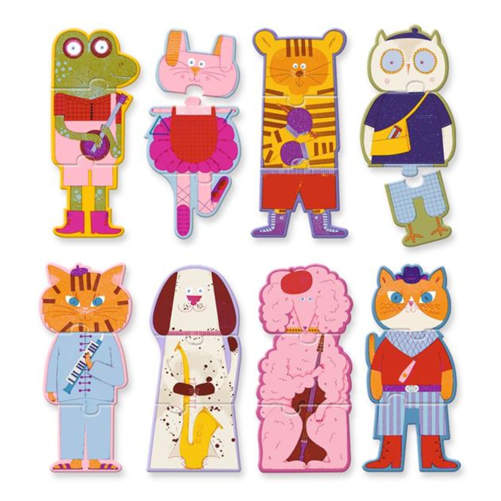 Djeco's Orchestra Puzzle Trio offers a fun vertical twist on classic animal puzzles. Kids match three pieces to build musical animals—think a cat playing drums or a bear with a trumpet. A sweet way to introduce sequencing, observation, and fine motor skills, all while getting into the rhythm of play.  Packaged in a colourful box with a string handle making it fun and easy to transport.
