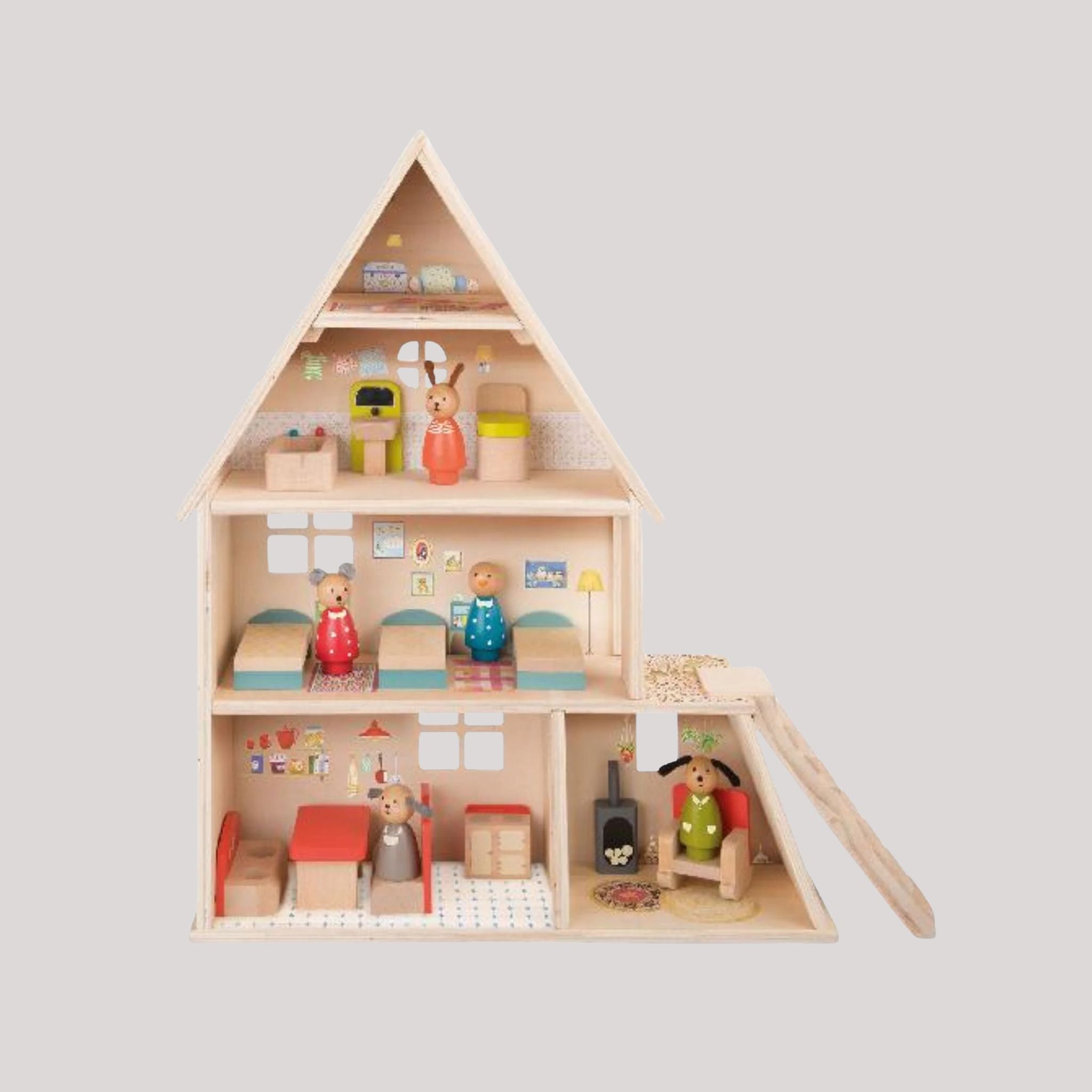 This beautiful wooden dollhouse has everything you need for hours of fun. With its 3 floors and its attic, in addition to its removable furniture, and fully equipped kitchen, it will allow your child to develop their imaginative play. Characters sold separately.