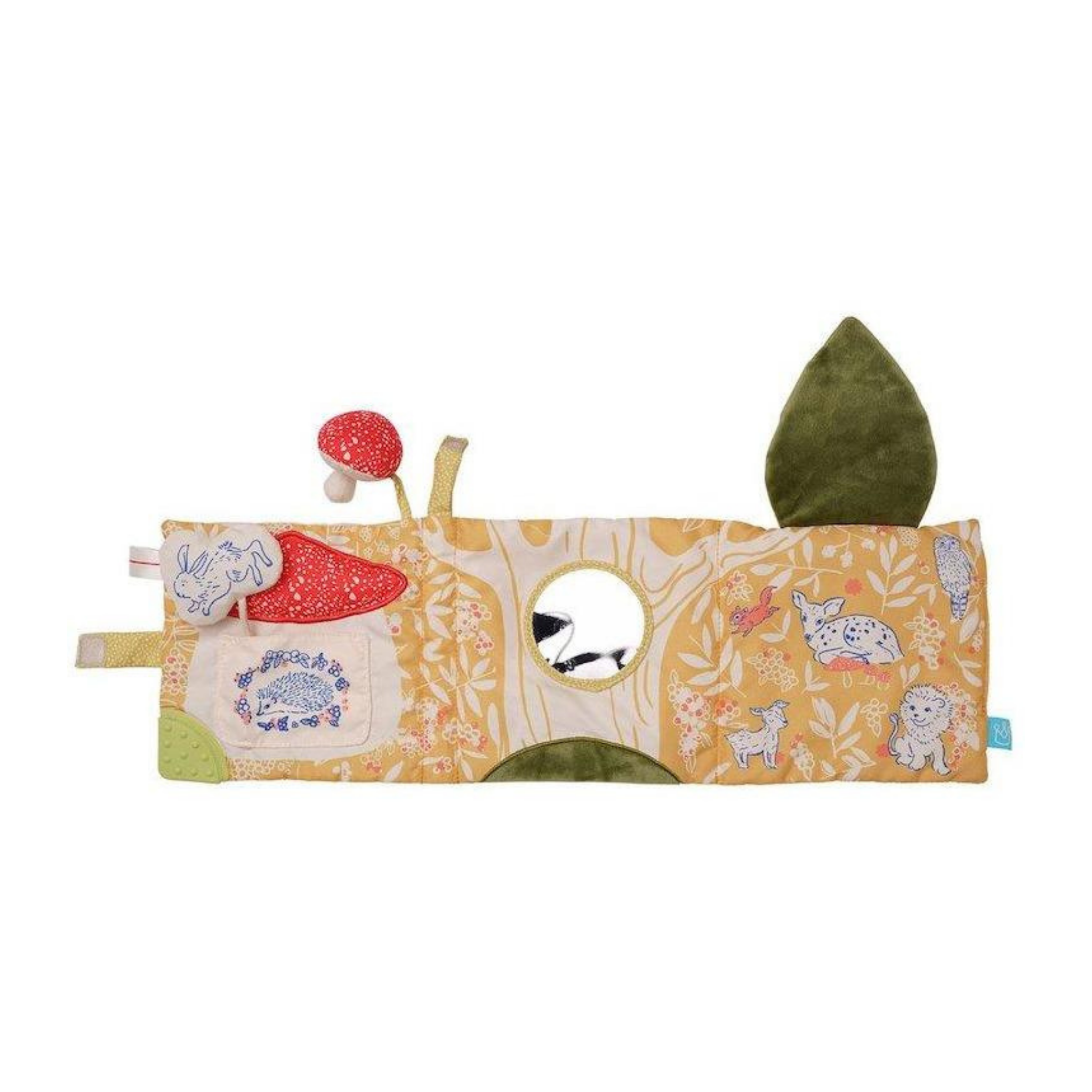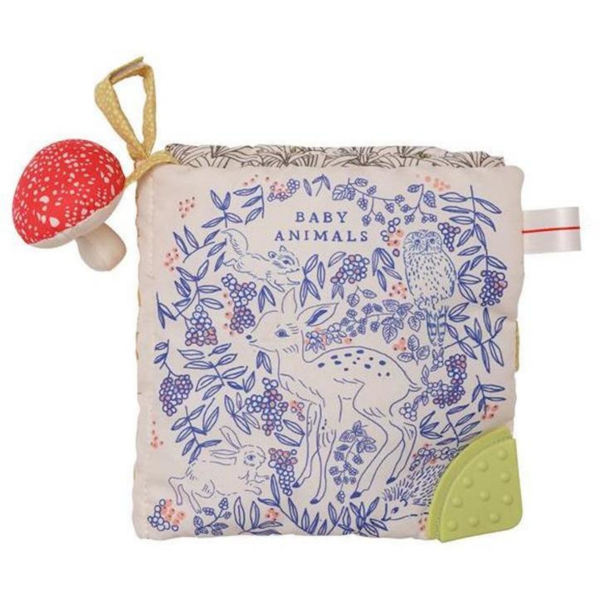 This animal-themed soft activity book folds out flat for tummy-time. Each page features nostalgic illustrations, various fabric textures and playful surprises. A fabric closure keeps pages neat when playtime is over. Activities include peek-a-boo crinkle leaf, textured teether corner, baby-safe discovery mirror, a tethered on squeaker mushroom and crinkle bunny. Fabric loop allows for attachment to baby links, carriers, strollers and more. Encourages tummy-time play, motor development, sensory stimulation and cause and effect learning.