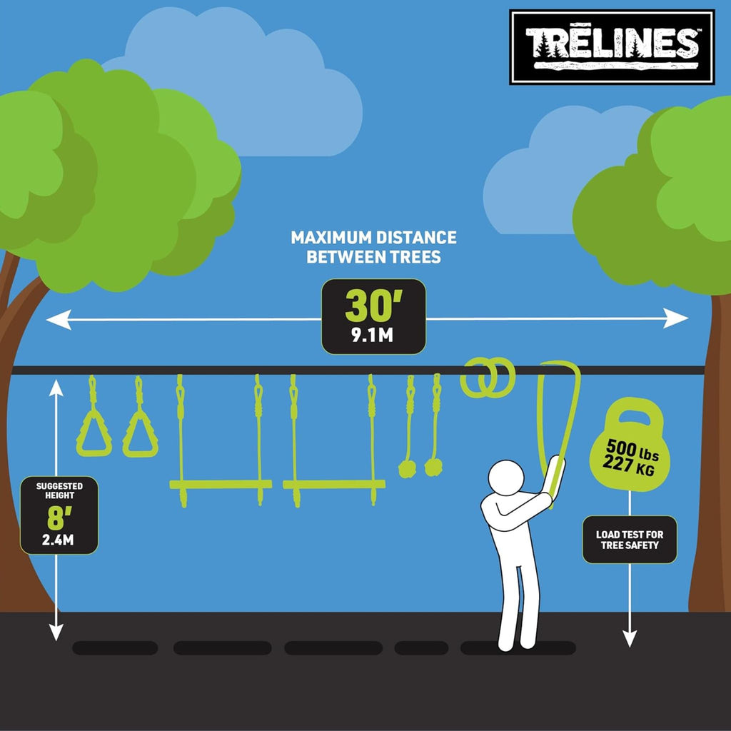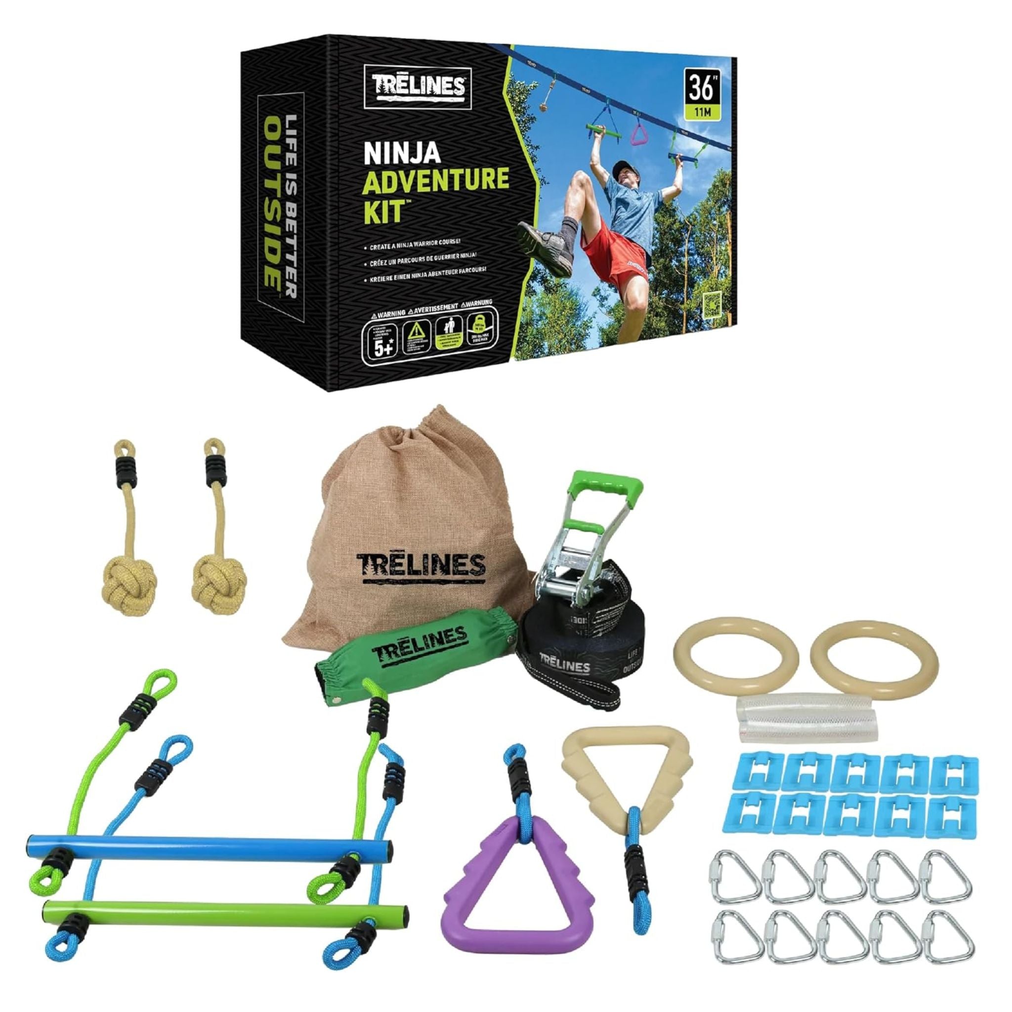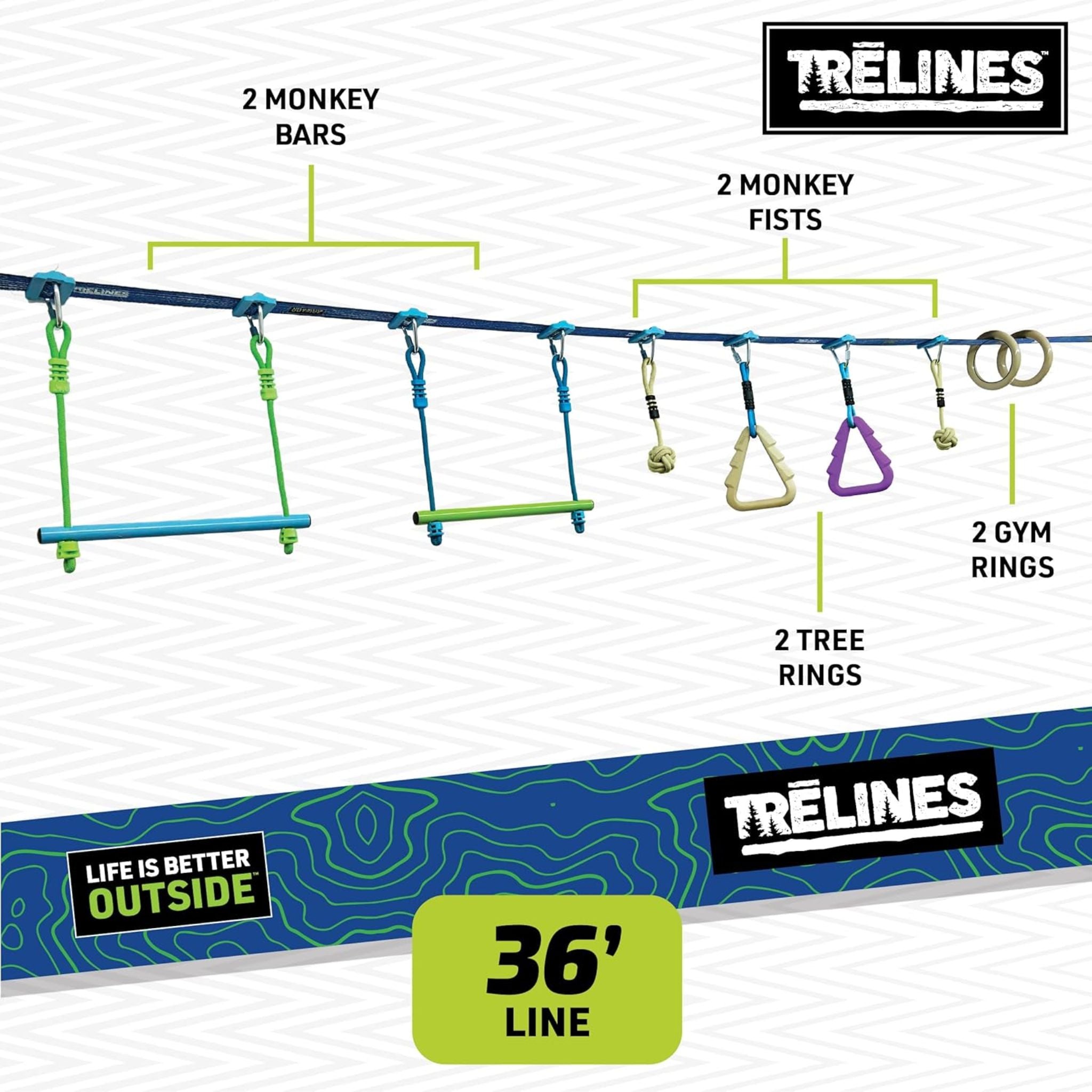 Includes: a heavy-duty 36′ line, 2 monkey bars, 2 tree holds, 2 monkey fists, 2 gym rings, ratchet cover, 8 delta carabiners and line clips (for attaching obstacles to the line), and drawstring bag.