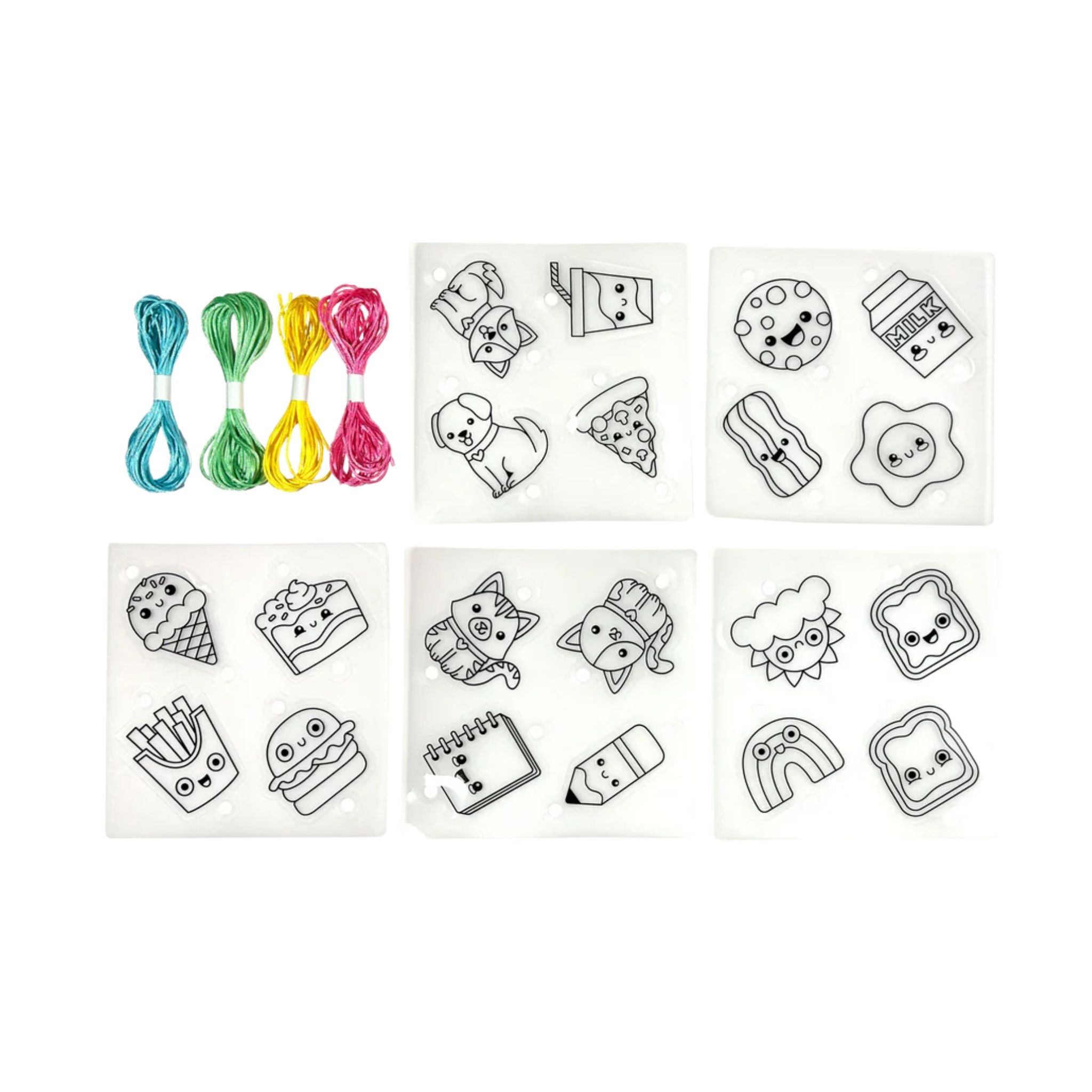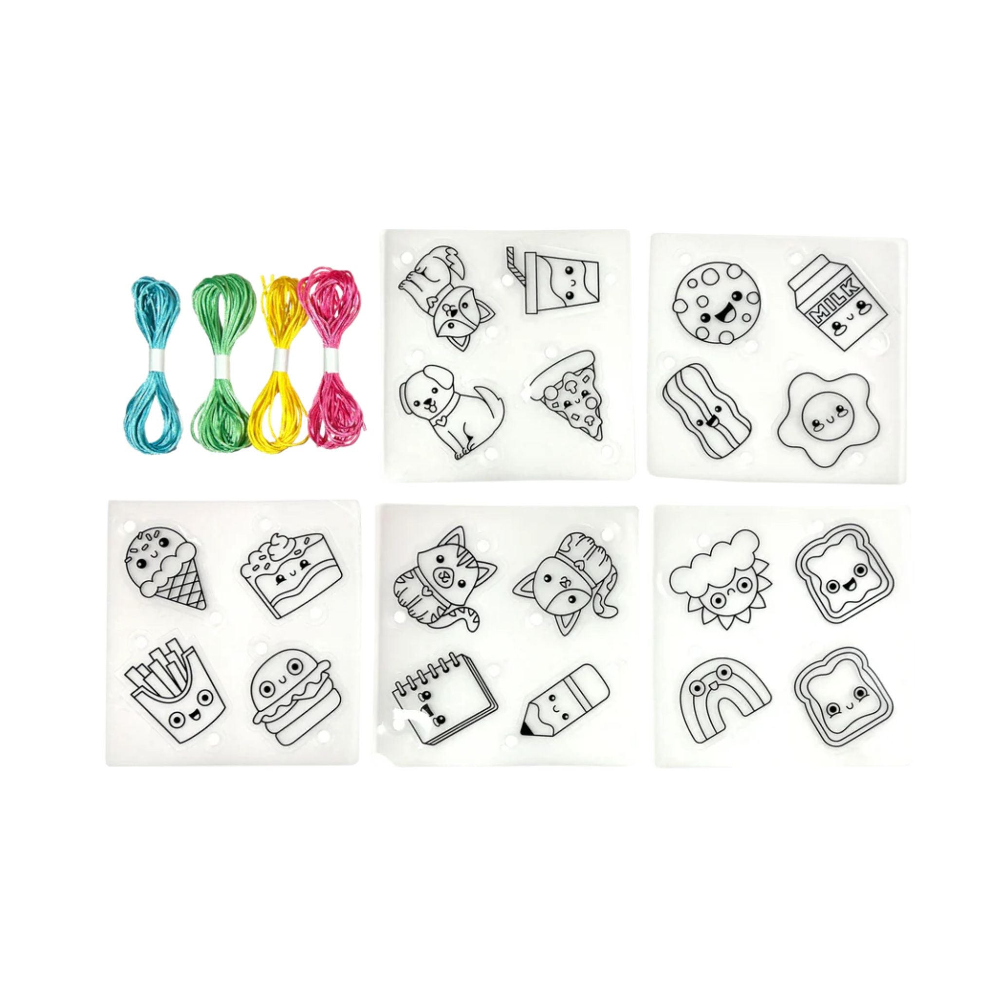 Includes:  20 pre-cut shrink plastic charms and 4 colored cords in blue, green, yellow and red