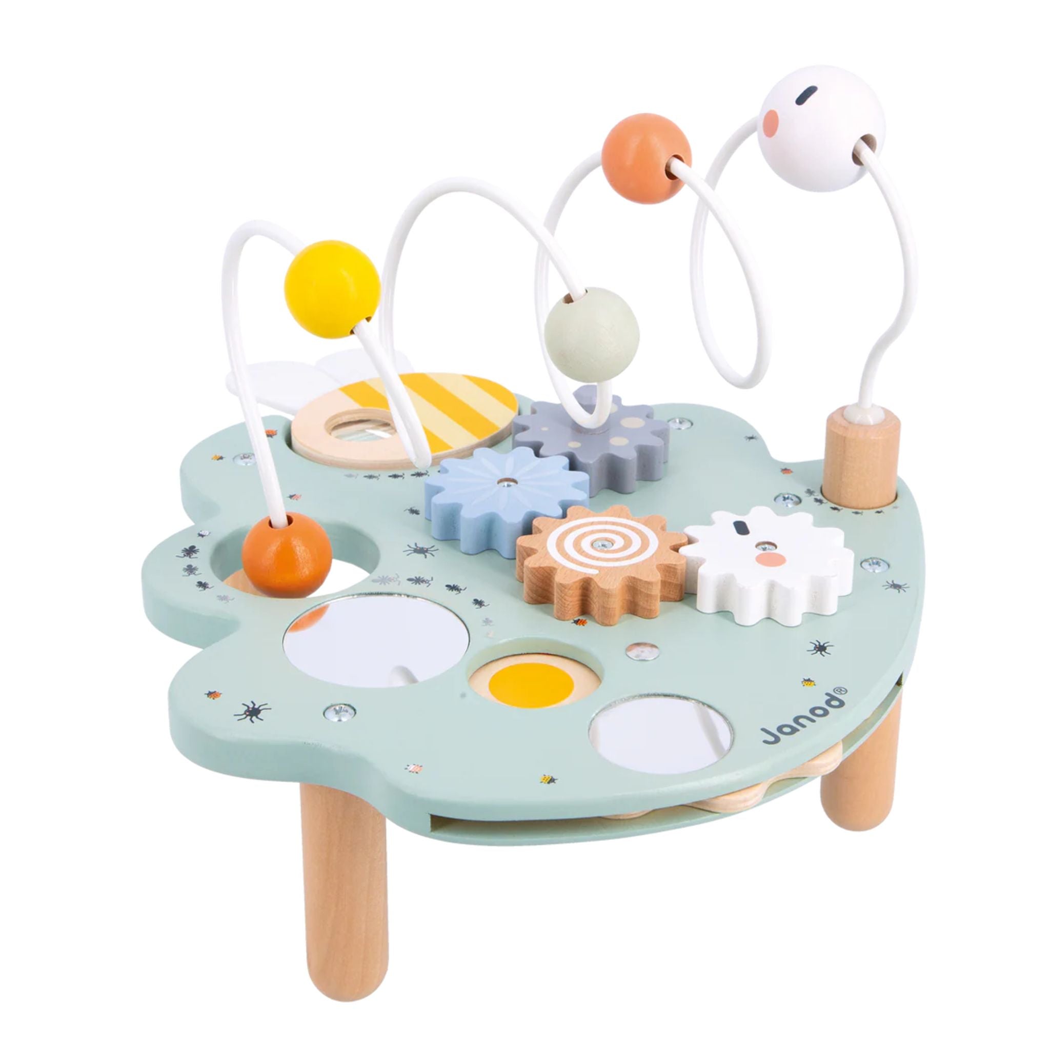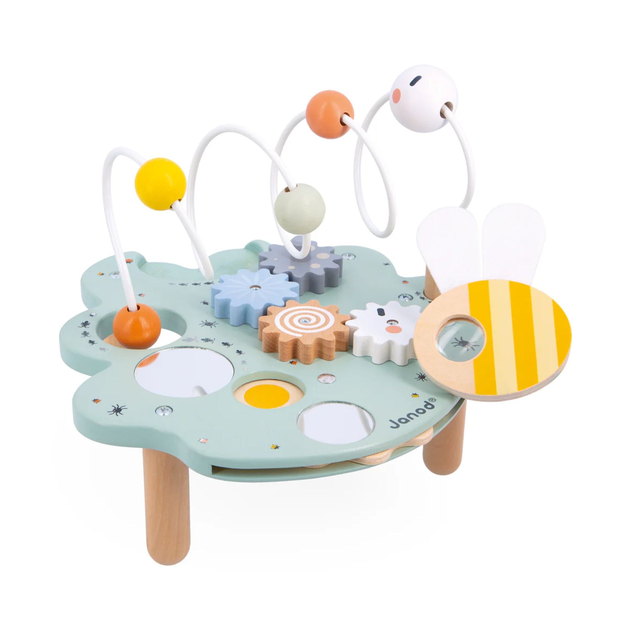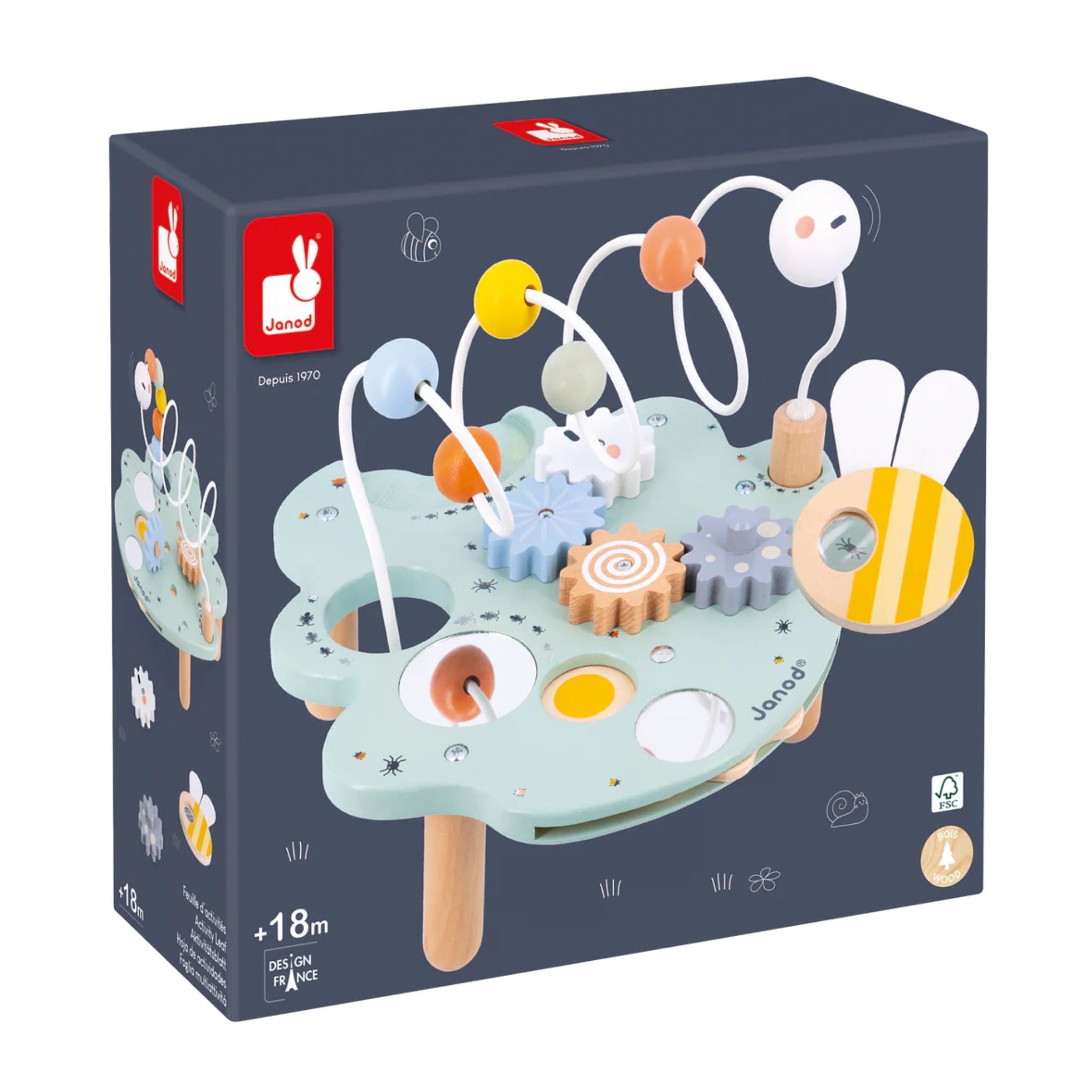 Activity Leaf is an early-learning toy that offers many fun activities for babies. Five activities are included in total: 4 gears that can be turned time and time again, 2 mirrors to observe one’s reflection, 1 colour wheel, 1 bee-shaped magnifying glass to discover all the little insects that decorate the leaf, and 1 giant caterpillar-shaped looping toy with sliding elements.