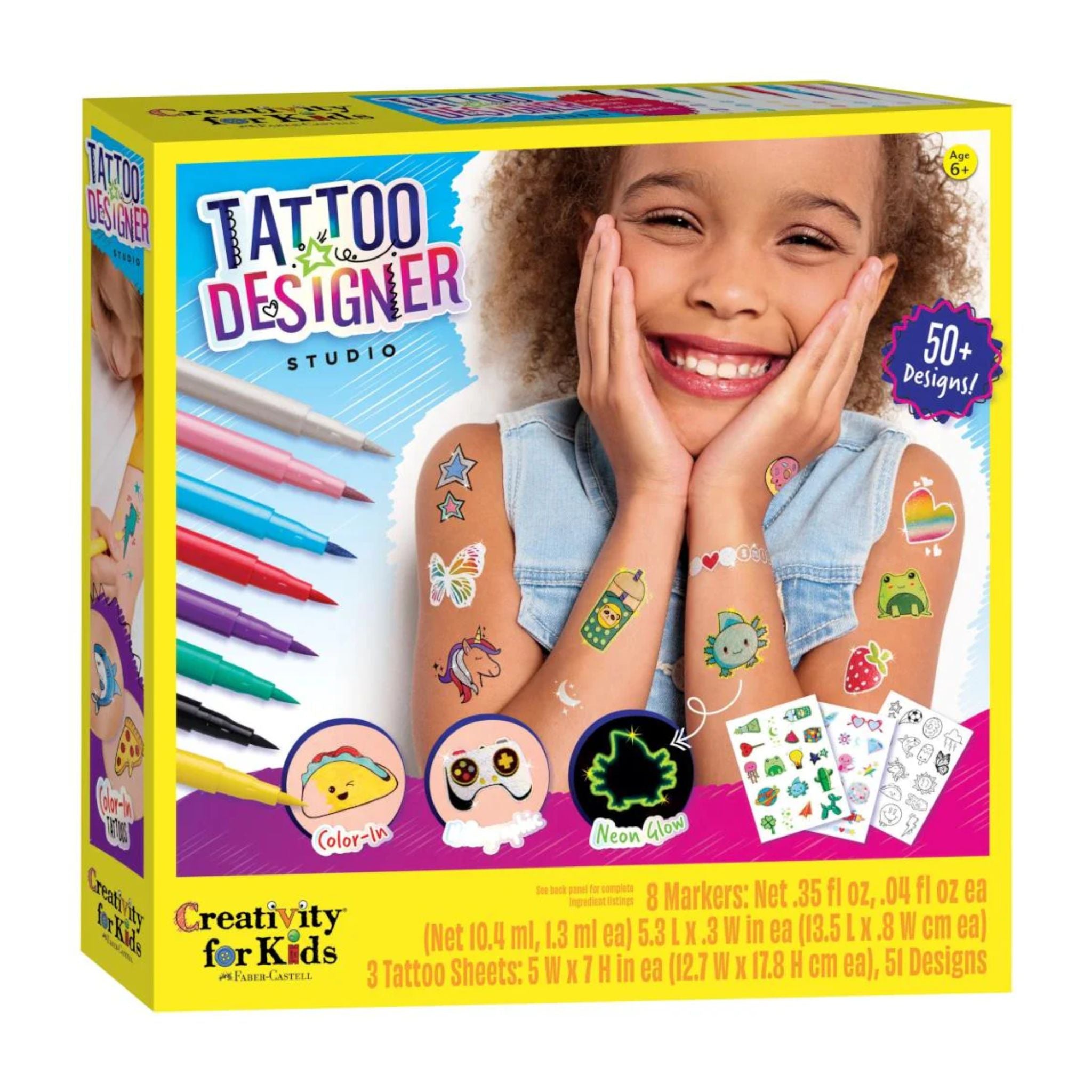 The Tattoo Designer Studio, temporary body art kit features fabulous brush tip tattoo markers and over 50 trendy temporary tattoo designs.  Show off your style with 50+ temporary tattoo designs including color-in, neon glow and holographic sheets