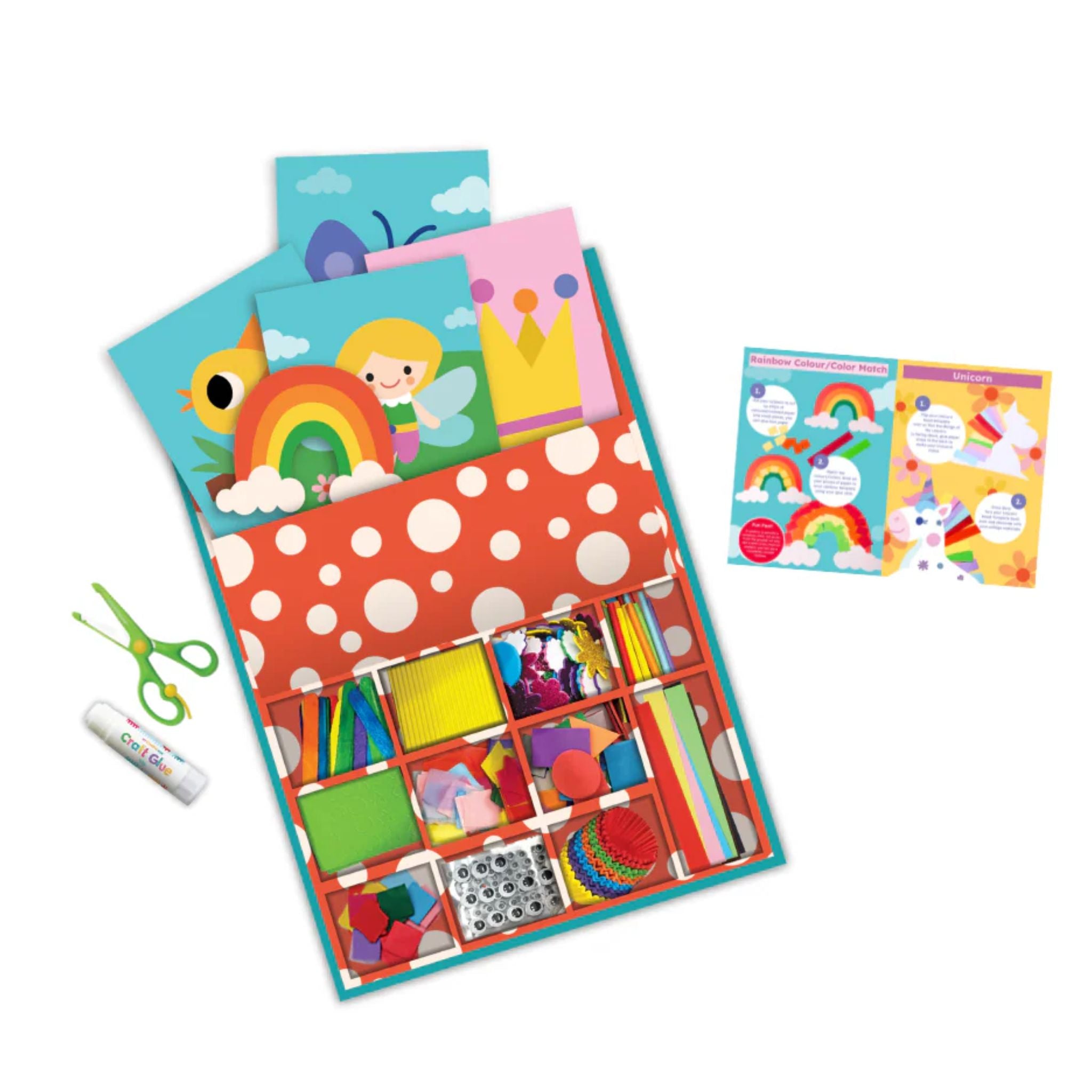 Filled with easy Fairy and Unicorn Crafts, magical materials and whimsical textures, this kit lets you create your own fantastical world of unicorns and fairies. With an easy ideas guide and charming templates, it’s perfect for crafting dreamlike collages. All packed in a sturdy, compact box for mess-free crafting and cleanup.